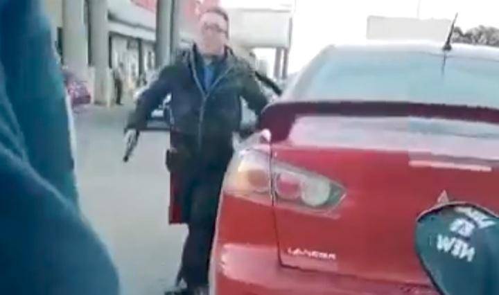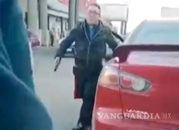 Internautas han apodado al hombre que aparece en un video como “Lord pistola’’, mismo que se le puede observar manejar un vehículo Mitsubishi color rojo al momento del altercado