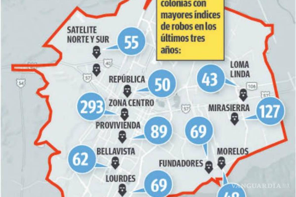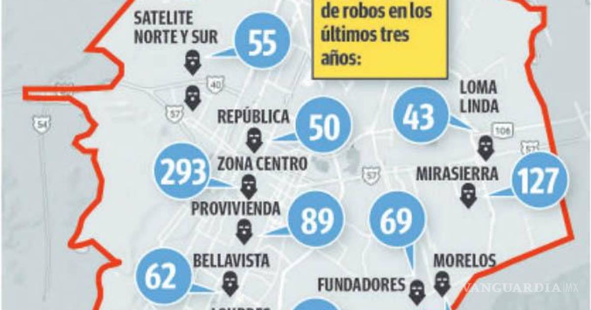 Las colonias con más robos de este tipo son la Zona Centro, con 73 robos; La Salle, con 16; Lomas de Lourdes, con 17; Mirasierra y Nuevo Mirasierra con 23; y República con 20.