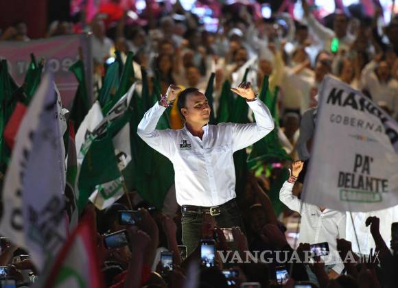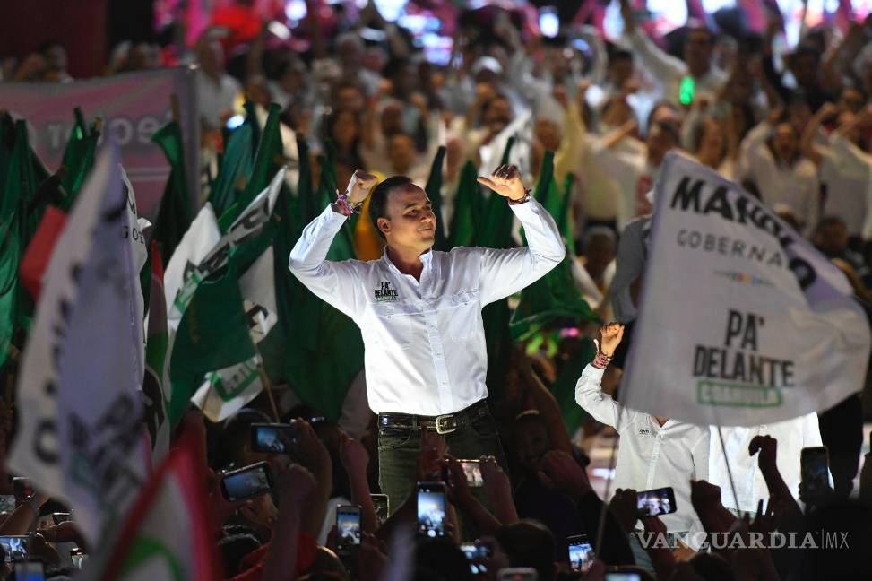 “Este 4 de junio vamos todos juntos, como la gran familia que somos, a seguir construyendo la grandeza de esta tierra bendita, porque si Dios y la gente con nosotros, ¿quién contra nosotros? Aquí en Coahuila, puro pa´delante porque pa´tras, ni pa´garrar vuelo”, expresó en el cierre de campaña realizado en terrenos de la Feria, acompañado de su esposa Paola Rodríguez López.