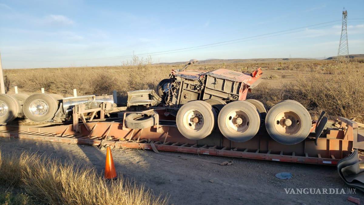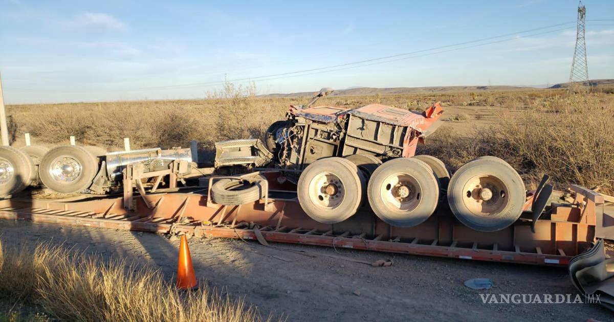 El tractocamión y el remolque tipo plataforma, quedaron con los neumáticos hacia arriba a un lado del camino, a la altura del kilómetro 152, en el municipio de Parras.