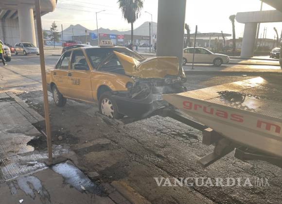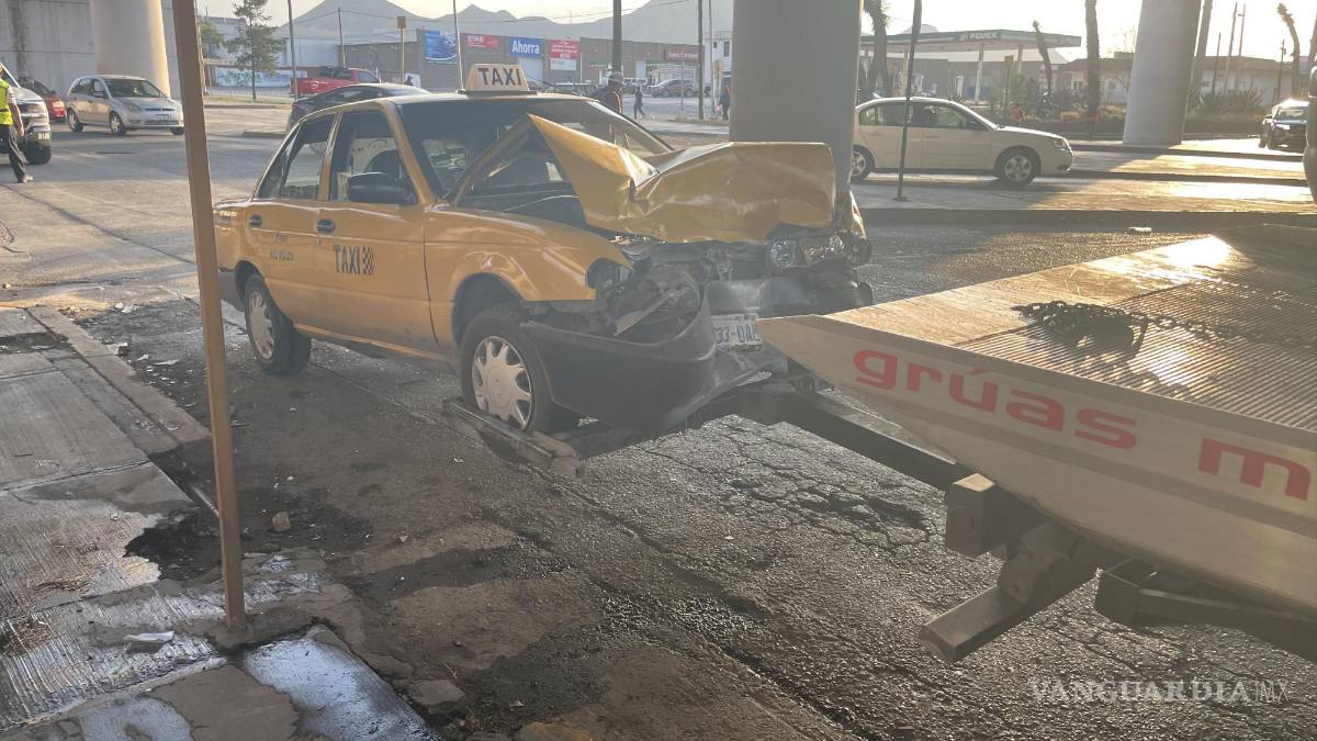 Un fuerte choque entre un vehículo Nissan Tiida y un taxi Nissan Tsuru en el cruce del bulevar Vito Alessio Robles y el periférico Echeverría, al norte de Saltillo, dejó una persona herida y daños considerables en ambos automóviles.