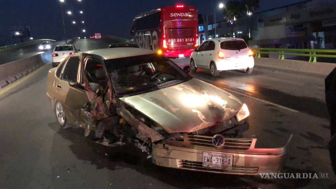 Destrozado y de frente a la circulación quedó el vehículo de un hombre que al aparentemente quedar dormido al volante chocó contra la base del inicio del puente de Rufino Tamayo sobre Nazario Ortiz Garza la mañana de ayer.
