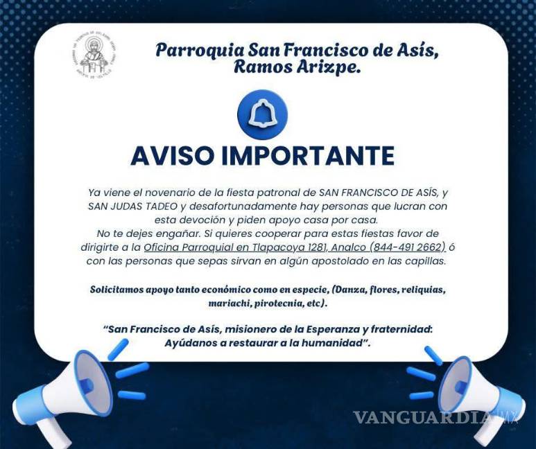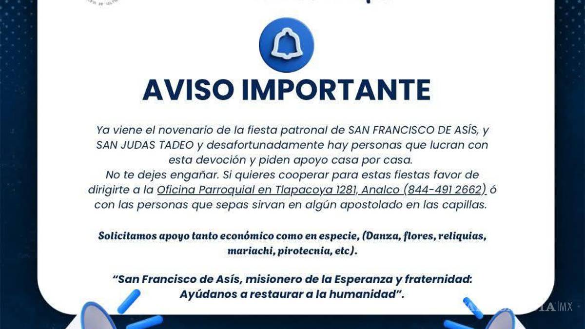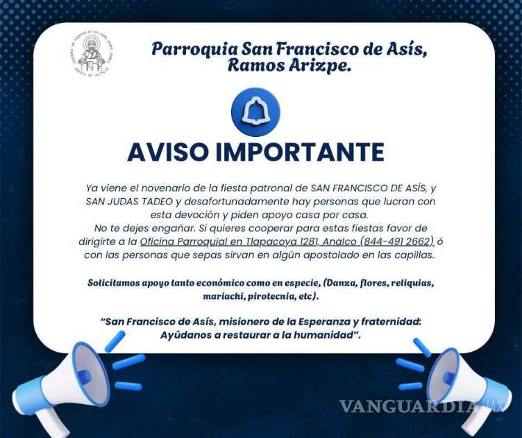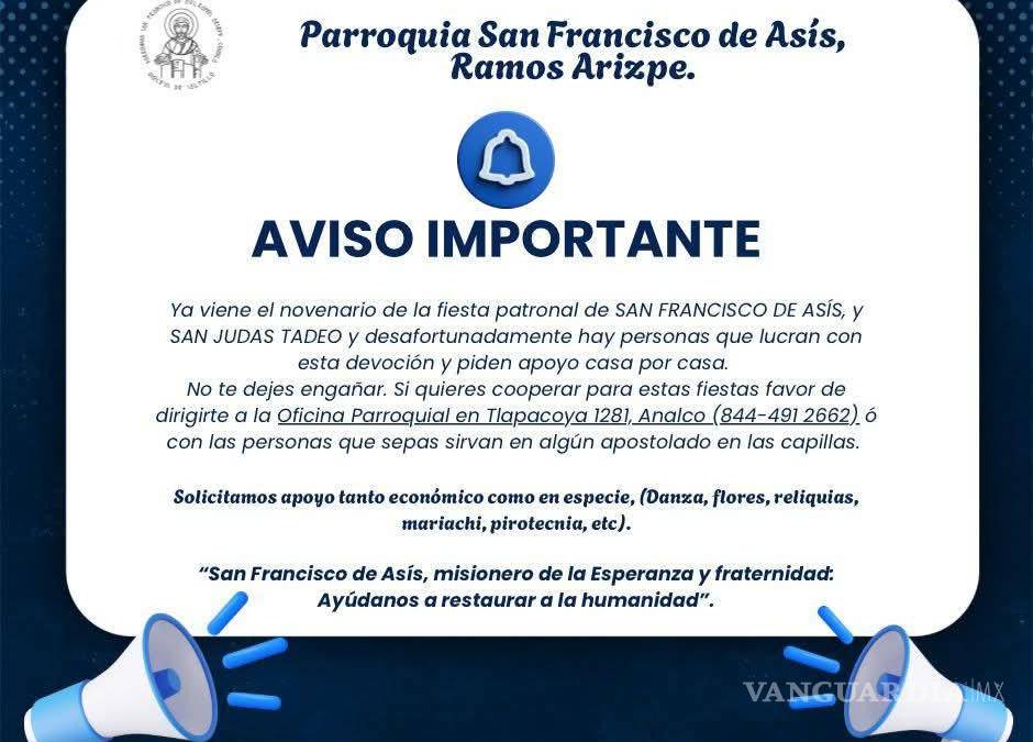 La comunidad católica de Ramos Arizpe emitió una importante advertencia ante la proliferación de fraudes. Esto ocurre en vísperas de las fiestas patronales dedicadas a San Francisco de Asís y San Judas Tadeo.