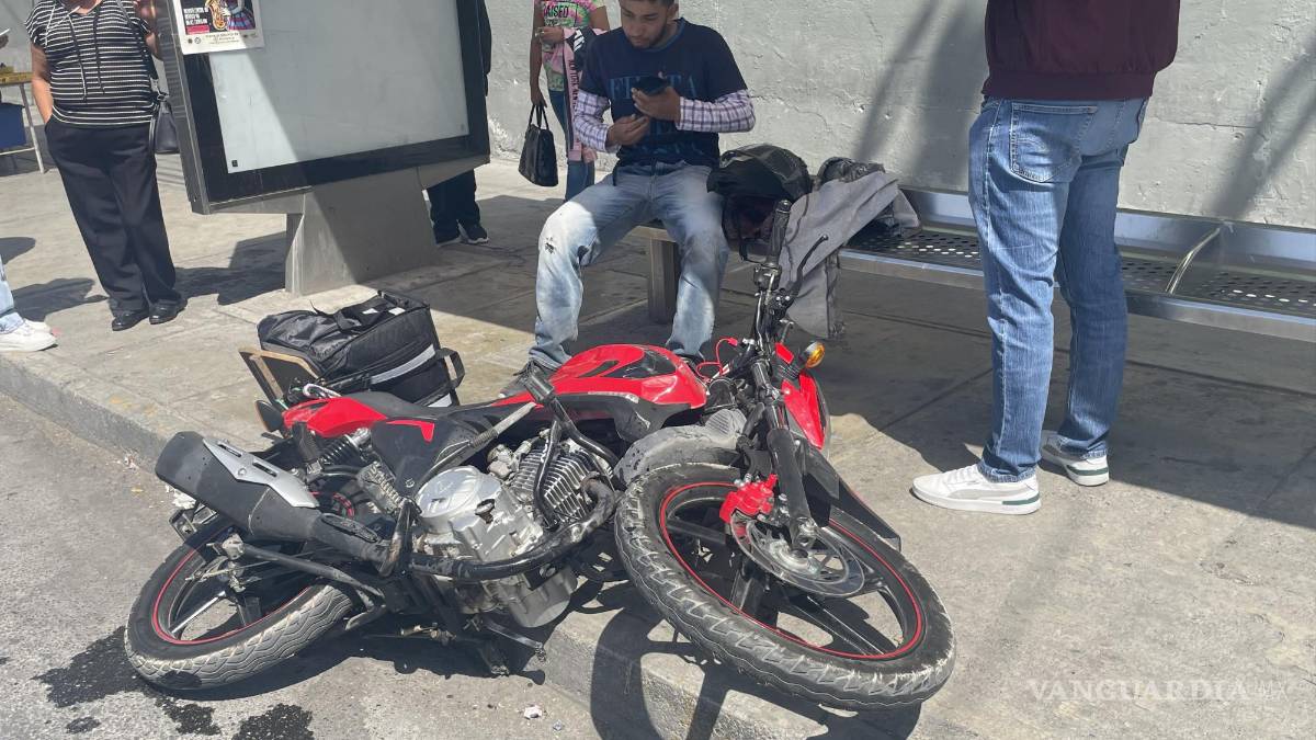 Un repartidor de alimentos en motocicleta resultó gravemente herido en su pierna izquierda después de ser derribado por un vehículo que le quitó el derecho de paso, en la Zona Centro de Saltillo.
