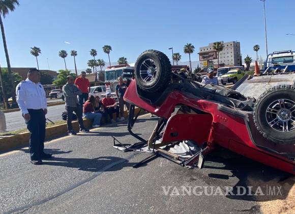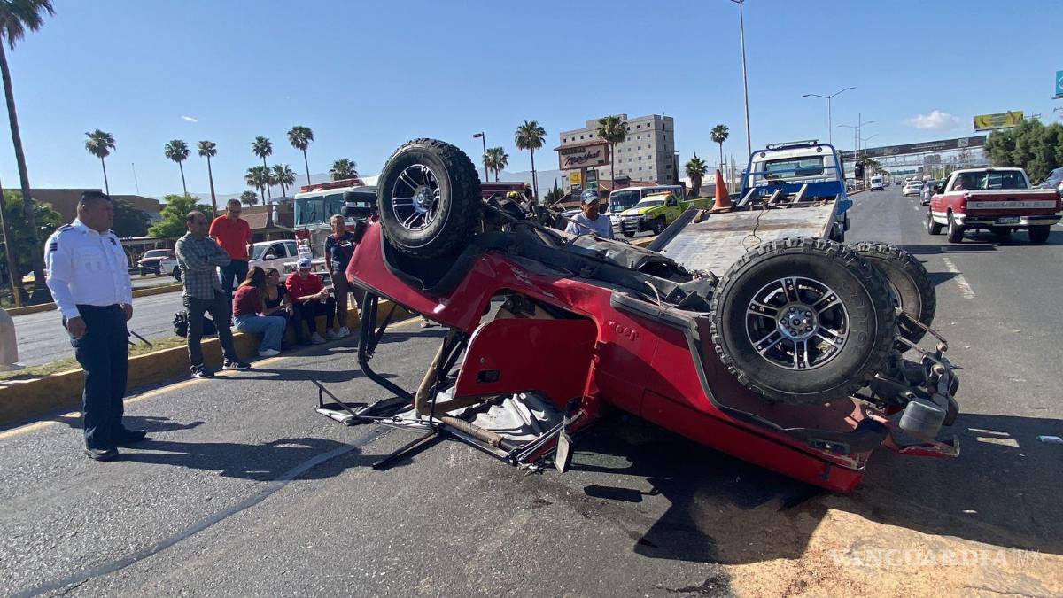 Imprudente conductora ocasiona choque múltiple y termina volcada, al norte de Saltillo