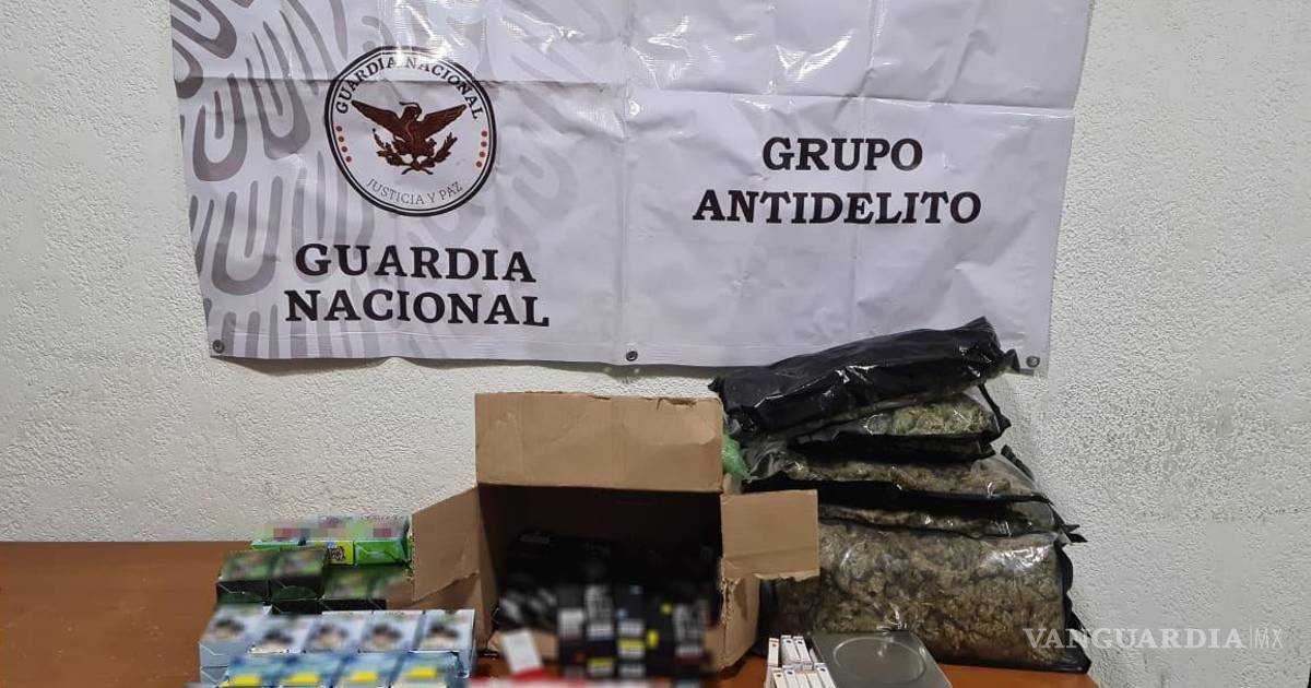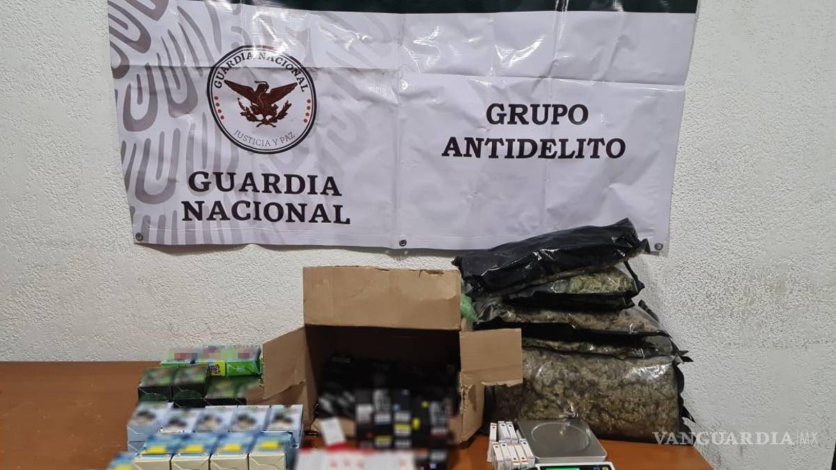 Elemento de la Guardia Nacional, con apoyo de binomios caninos, decomisaron este viernes paquetes que contenían aparentemente marihuana y cartuchos para cigarros electrónicos al parecer con aceite de cannabis, en Torreón y Saltillo.