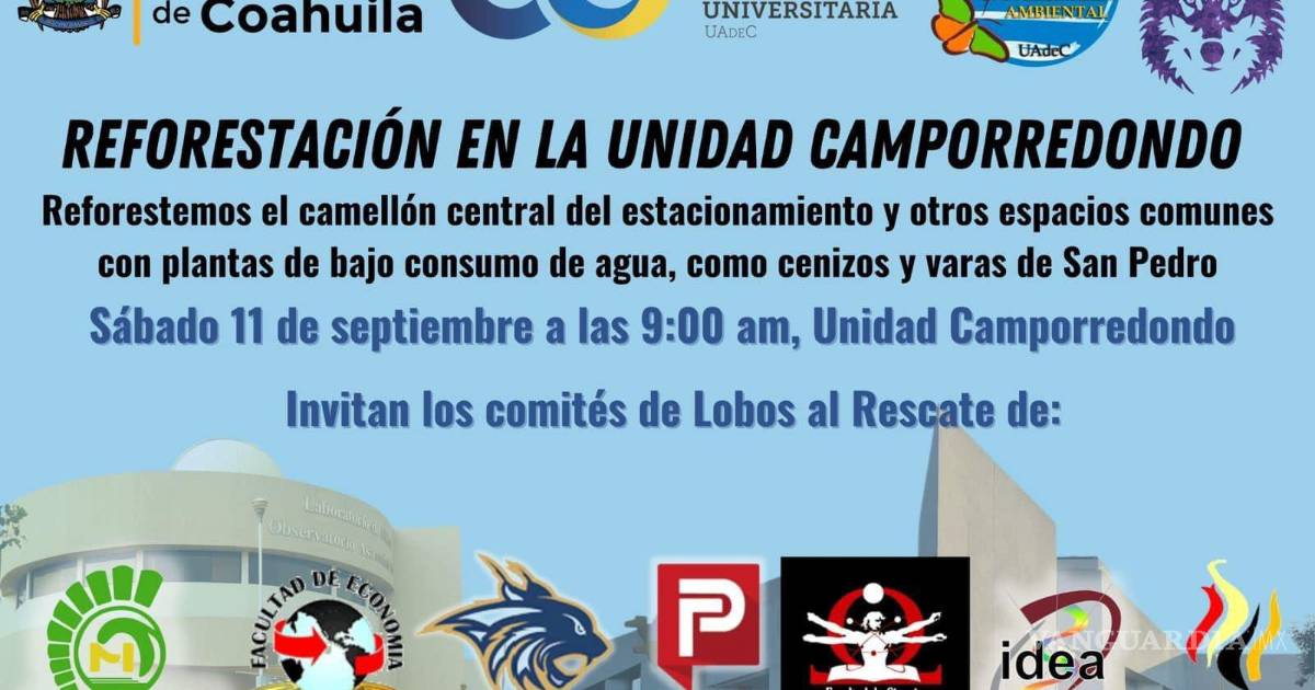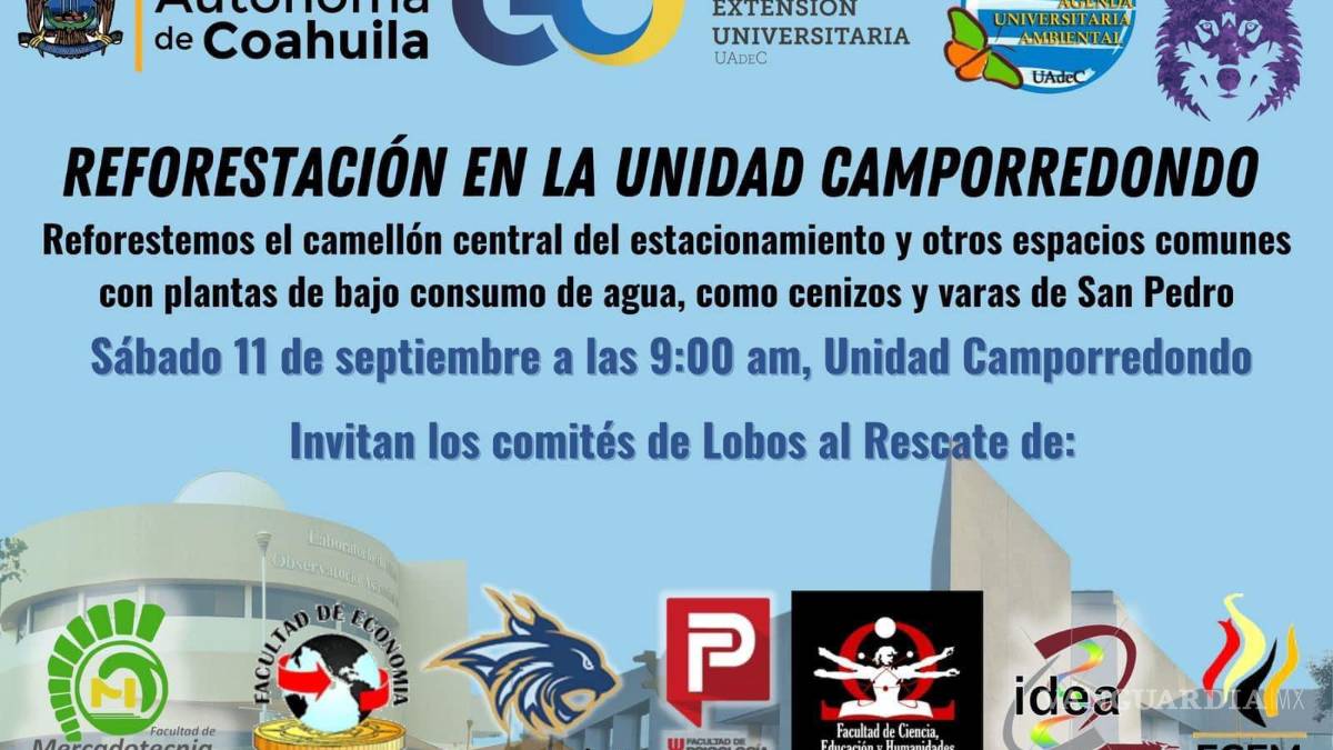 Para destacar la importancia que tienen los espacios verdes y árboles en las instalaciones con las que cuenta la Universidad Autónoma de Coahuila, la Coordinación General de Extensión Universitaria, la Coordinación de la Agenda Ambiental Universitaria y los comités de Lobos al Rescate, convocan a la comunidad universitaria a la reforestación de la Unidad Camporredondo este sábado 11 de septiembre a partir de las 09:00 horas.