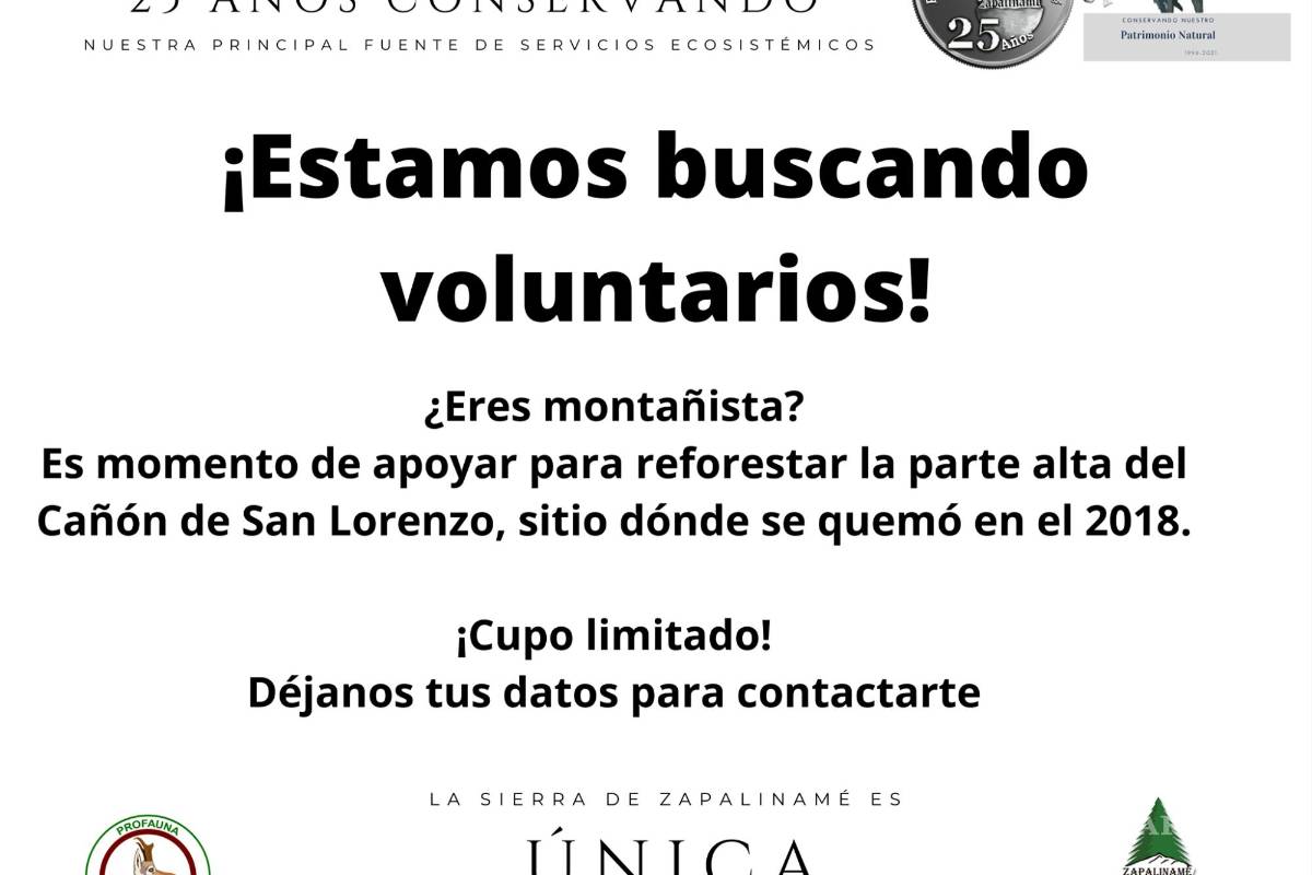 La asociación civil Profauna, encargada de la conservación de la Sierra de Zapalinamé, solicitó voluntarios para iniciar labores de reforestación este sábado y domingo en la parte alta del Cañón de San Lorenzo, que sufrió un incendio en 2018.
