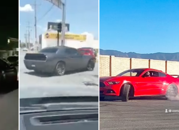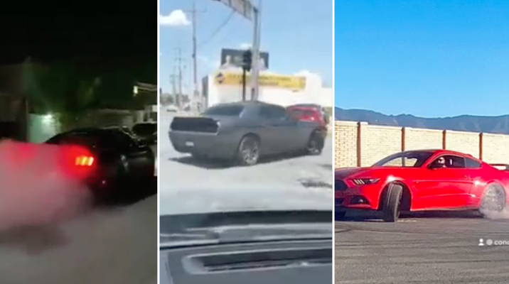 Se trata de un Ford Mustang color rojo, otro Mustang color negro y un Challenger gris. Este último fue grabado en el bulevar Pedro Figueroa, al norte de Saltillo, cuando se le vio dar un “acelerón” en la luz verde de un semáforo y más adelante girar a la derecha mientras realizaba un derrape.