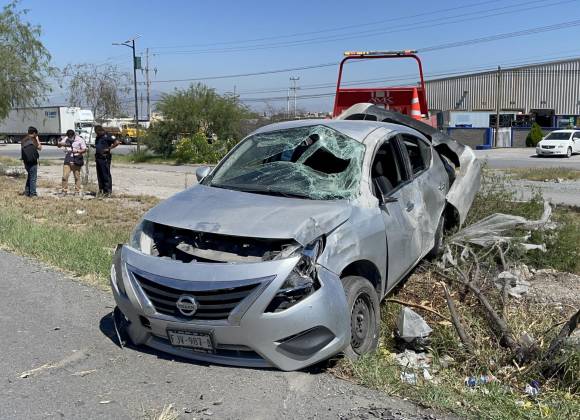 Le cierran el paso y vuelca en Ramos Arizpe; conductora resulta lesionada