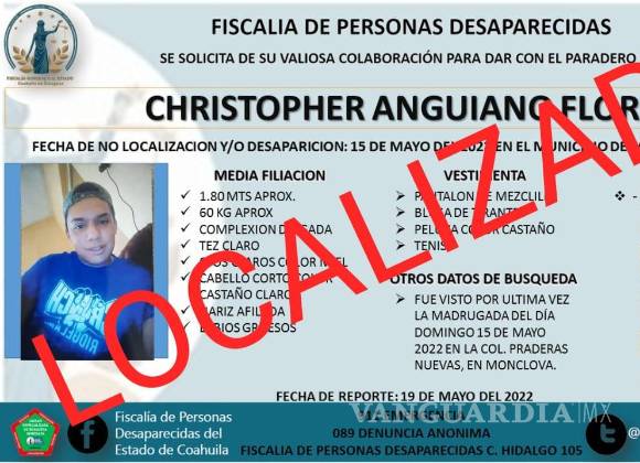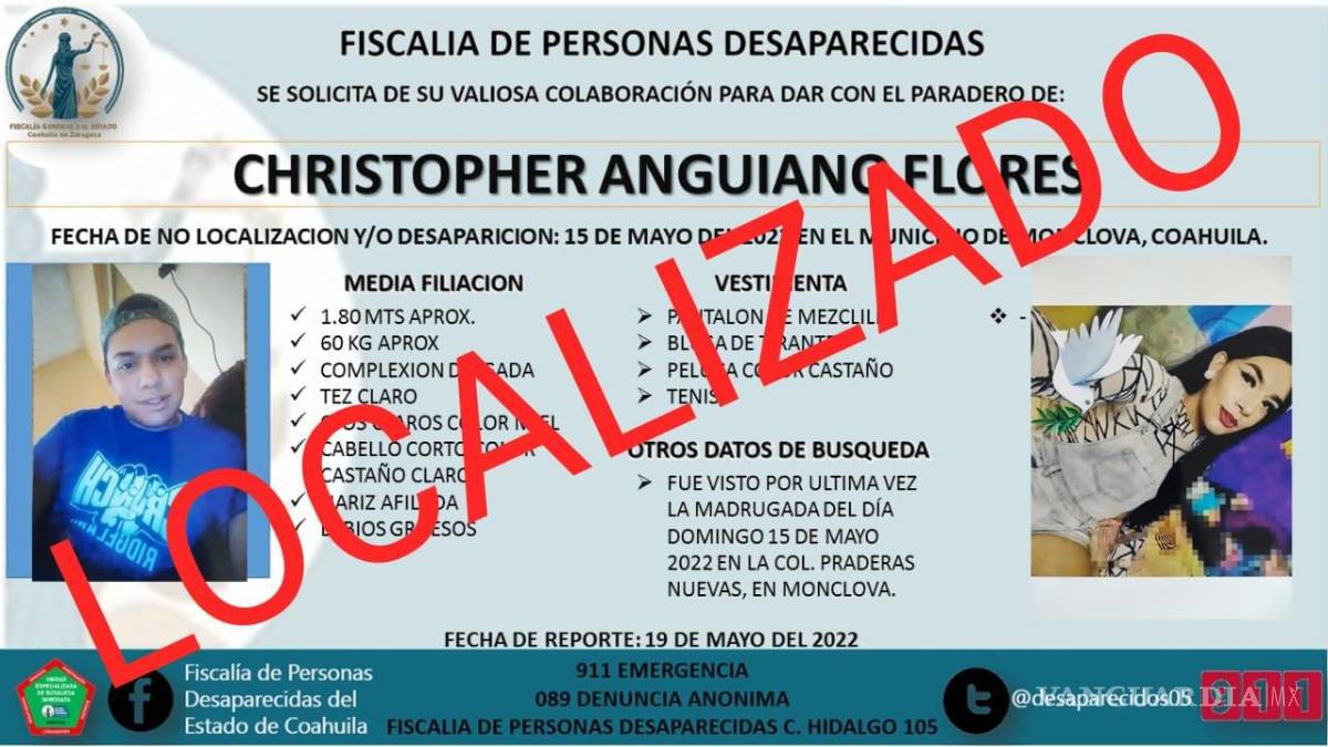Saltillo.- A través de un comunicado la Fiscalía de Personas Desaparecidas de Coahuila confirmó la localización del joven trans Christopher Anguiano Flores, quien fue reportado como desaparecido el pasado 20 de mayo en Monclova.