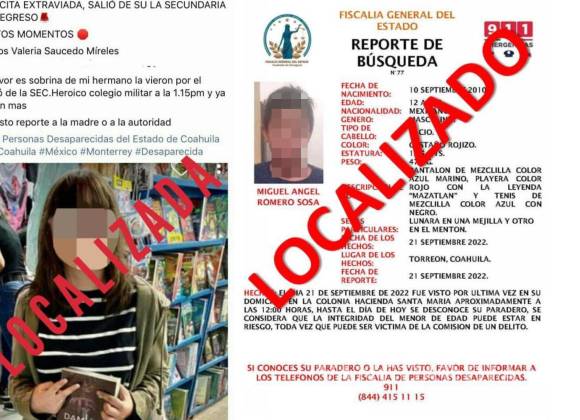 Además, otro menor originario de Torreón fue localizado tras varias horas desaparecido, quien también derivó en una ausencia voluntaria. El segundo en menos de tres días.