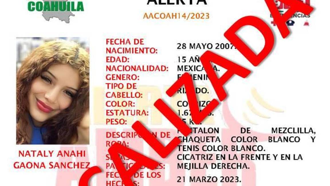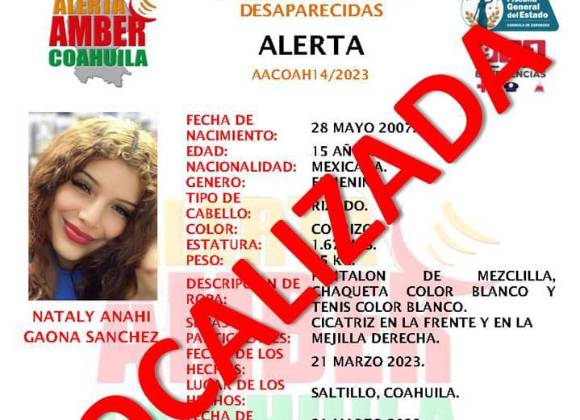 A través de un comunicado, la Fiscalía de Personas Desaparecidas del Estado de Coahuila aseguró que después de dos días de desconocer su paradero, Nataly Anahí Gaona Sánchez fue localizada con vida.