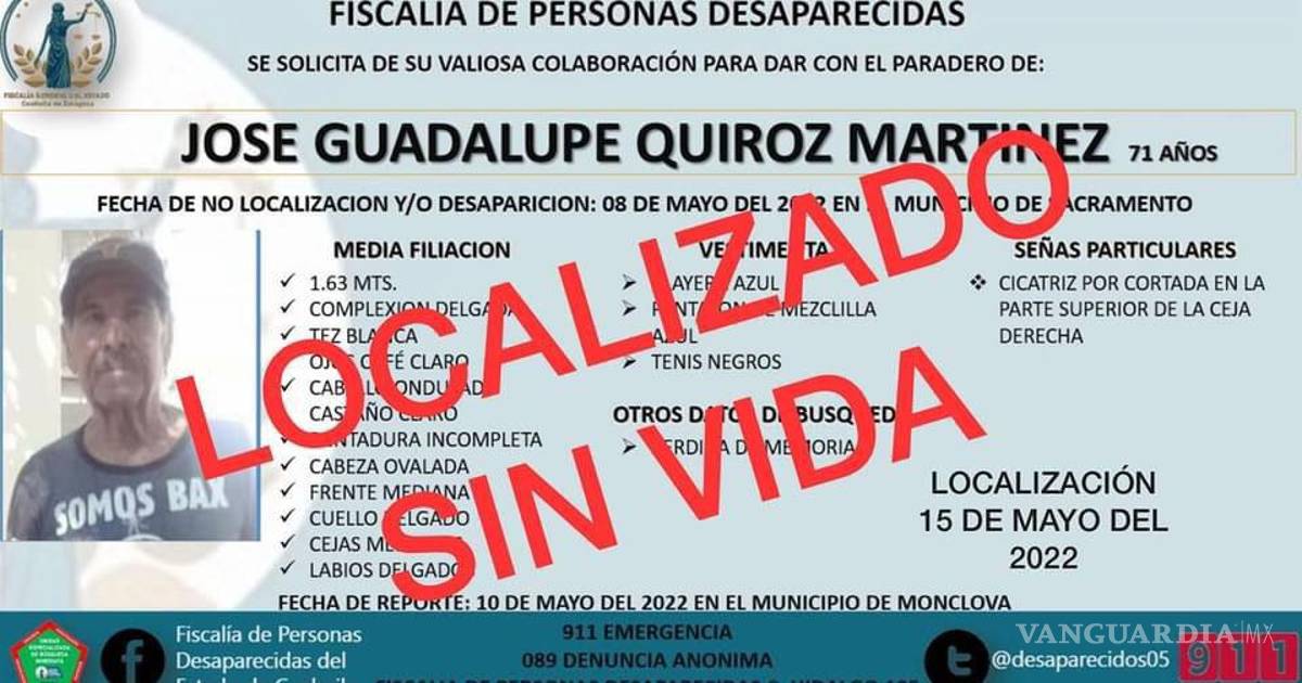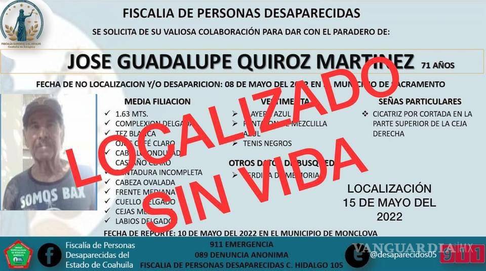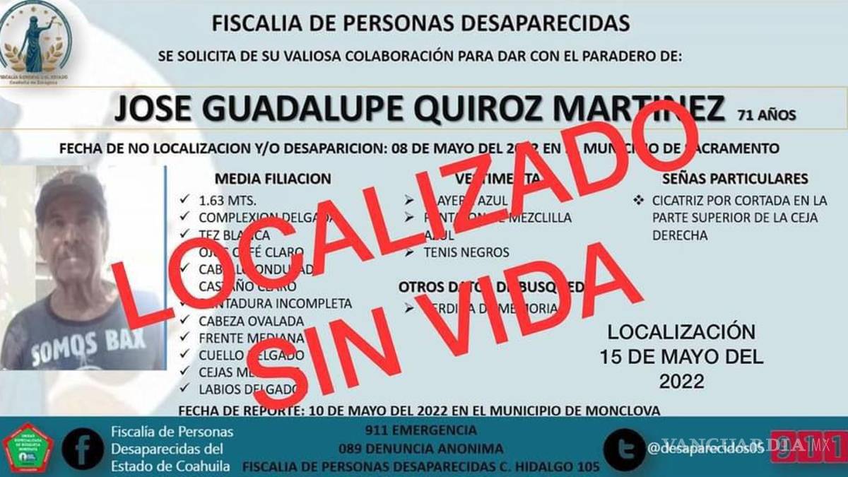 “Lo anterior toda vez de la Operatividad desplegada por Agentes de Investigación Criminal, Guardia Nacional, Policía Civil de Coahuila, Policía Municipal de Nadadores y Familiares de la Persona Desaparecida, quienes después de una ardua labor de búsqueda desdé el día 10 de Mayo a la fecha, se logro la localización de JOSE GUADALUPE en el Municipio de La Madrid, quien fue identificado plenamente por familiares, una vez realizados los protocolos correspondientes de Identificación, tratándose de un fallecimiento correspondiente a causas naturales”.