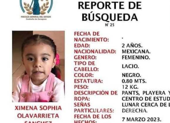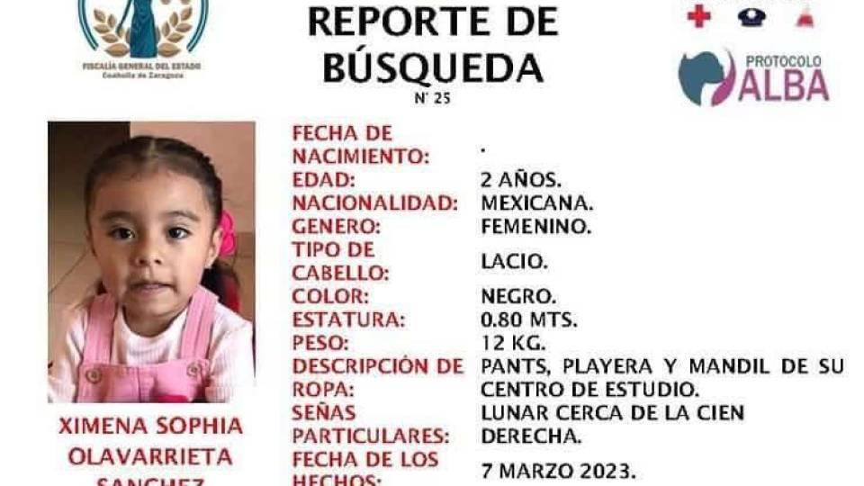 Por su parte la Fiscalía de Personas Desaparecidas implementó el Protocolo Alba para la búsqueda de la niña de dos años en Saltillo.