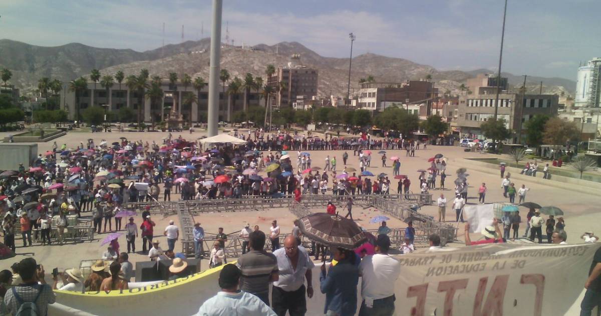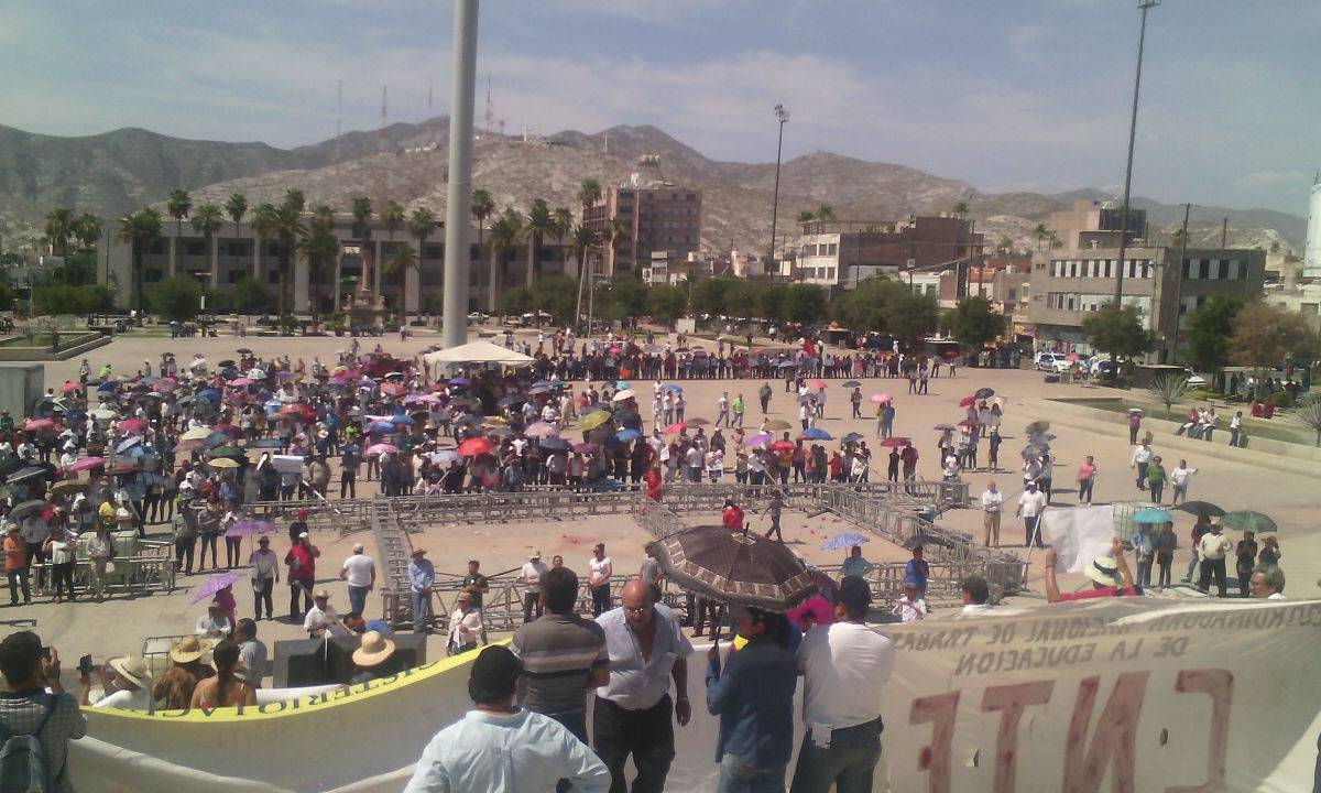 La Laguna.- Un grupo de aproximadamente medio millar de maestros de La Laguna de Durango pertenecientes a la Coordinadora Nacional de Trabajadores de la Educación (CNTE) se unieron a la manifestación que este domingo se llevó a cabo en la Plaza Mayor de Torreón para apoyar al magisterio de Oaxaca y protestar por la Reforma Educativa.