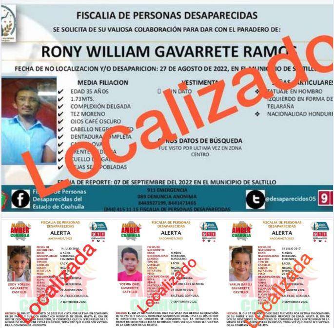A través de la Unidad de Investigación y Litigación de la Región Sureste informó que derivado de diversas acciones y de la coordinación con Familiares, se logró la localización de Rony William Gavarrete Ramos, Zeidi Yorleni Gavarrete Castillo, Yozmin Onel Gavarrete Castillo y Yarlin Dareli Gavarrete Castillo.