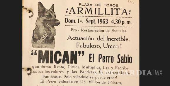 ¿Sabía usted que en una ocasión se presentó en Saltillo ¡El Increíble, Fabuloso, Unico! MICAN “El Perro Sabio”? Quizá desconoce o no recuerda que el domingo 1 de septiembre de 1963, la Plaza de Toros Fermín Espinosa “Armillita”, se llenó para presenciar el espectáculo del perro que sumaba, restaba, dividía, multiplicaba, leía y escribía.