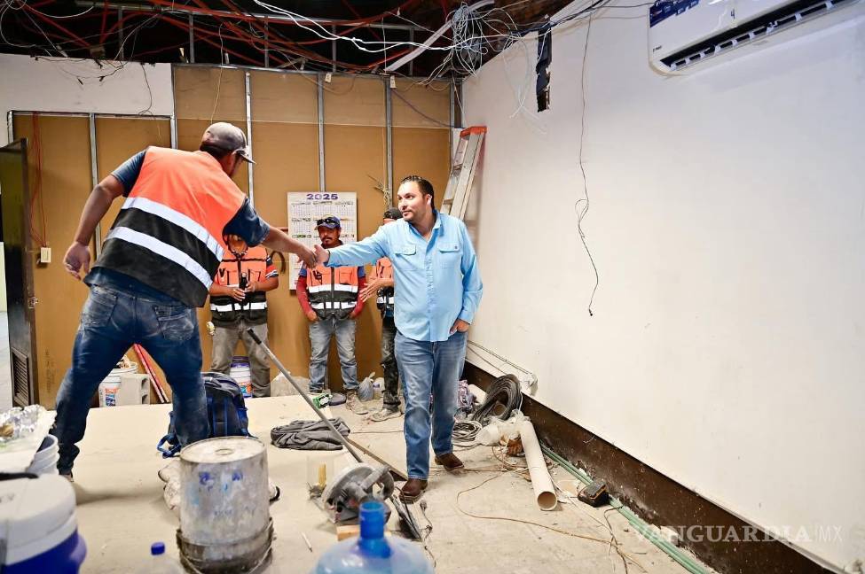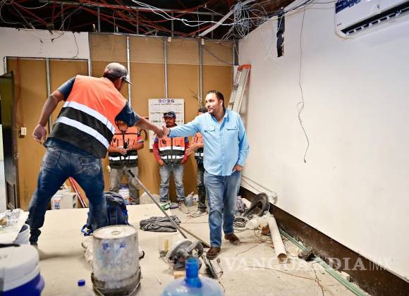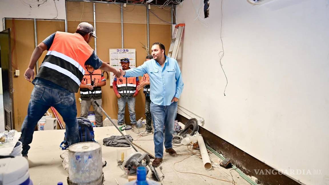 MONCLOVA, COAH.- Con el objetivo de revisar los avances de la obra de remodelación en el área del auditorio que se utilizará, de manera inicial, como Centro de Control y Comando (C2) para el monitoreo de cámaras urbanas, grupos de WhatsApp y comités de colonias, el alcalde Carlos Villarreal supervisó los avances de la obra.