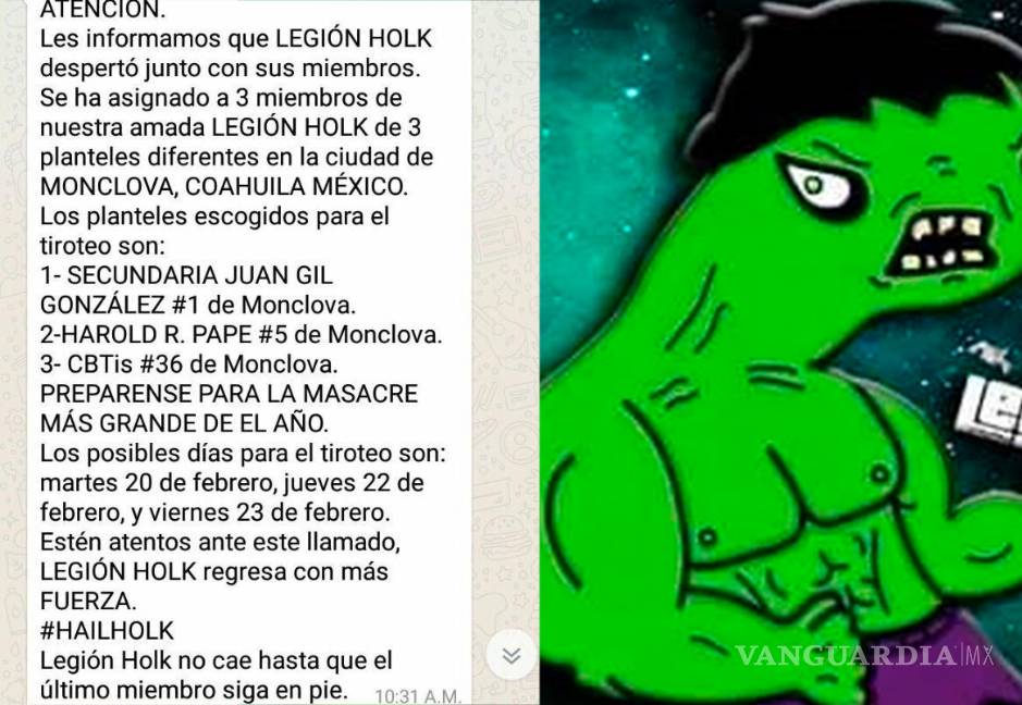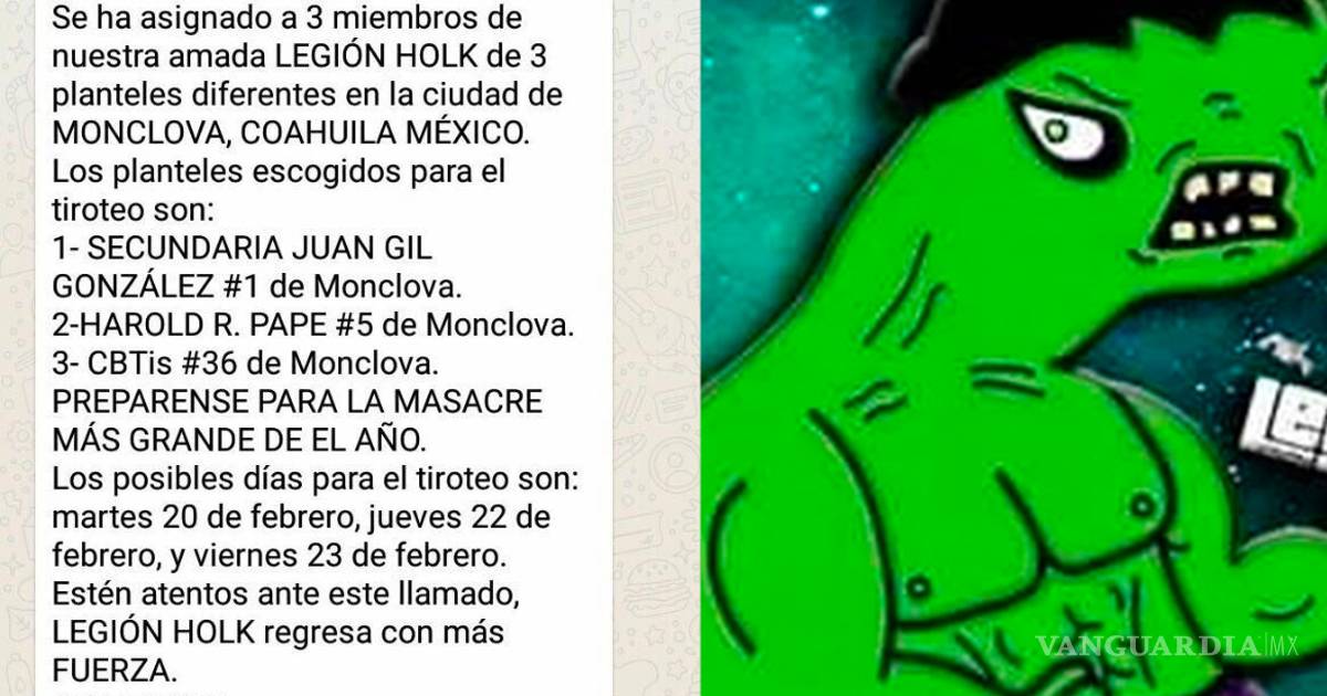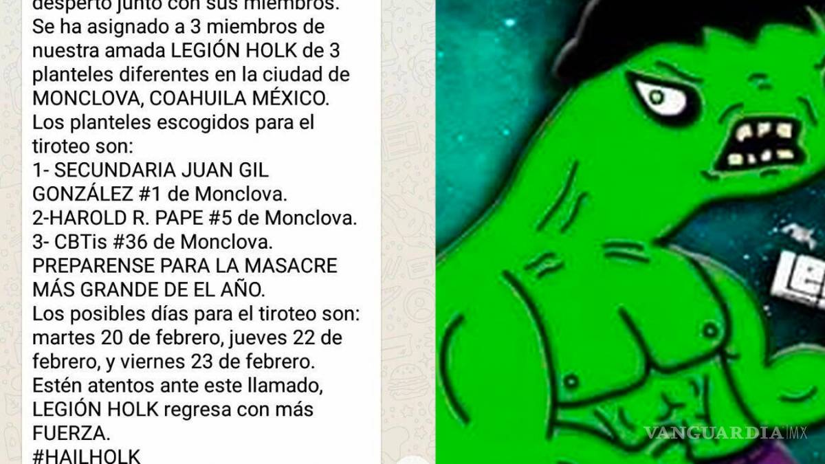"Les informamos que Legión Holk despertó junto con sus miembros. Se ha asignado a 3 miembros de nuestra amada Legión Holk de 3 planteles diferentes de la ciudad de Monclova, Coahuila, México. Los planteles escogidos para el tiroteo son Secundaria Juan Gil González #1, Harol R. Pape #5 y CBTis #36. Prepárense para la masacre más grande del año. Los posibles días para el tiroteo son martes 20 de febrero, jueves 22 de febrero y viernes 23 de febrero", fue el mensaje que se compartió en grupos el pasado fin de semana.
