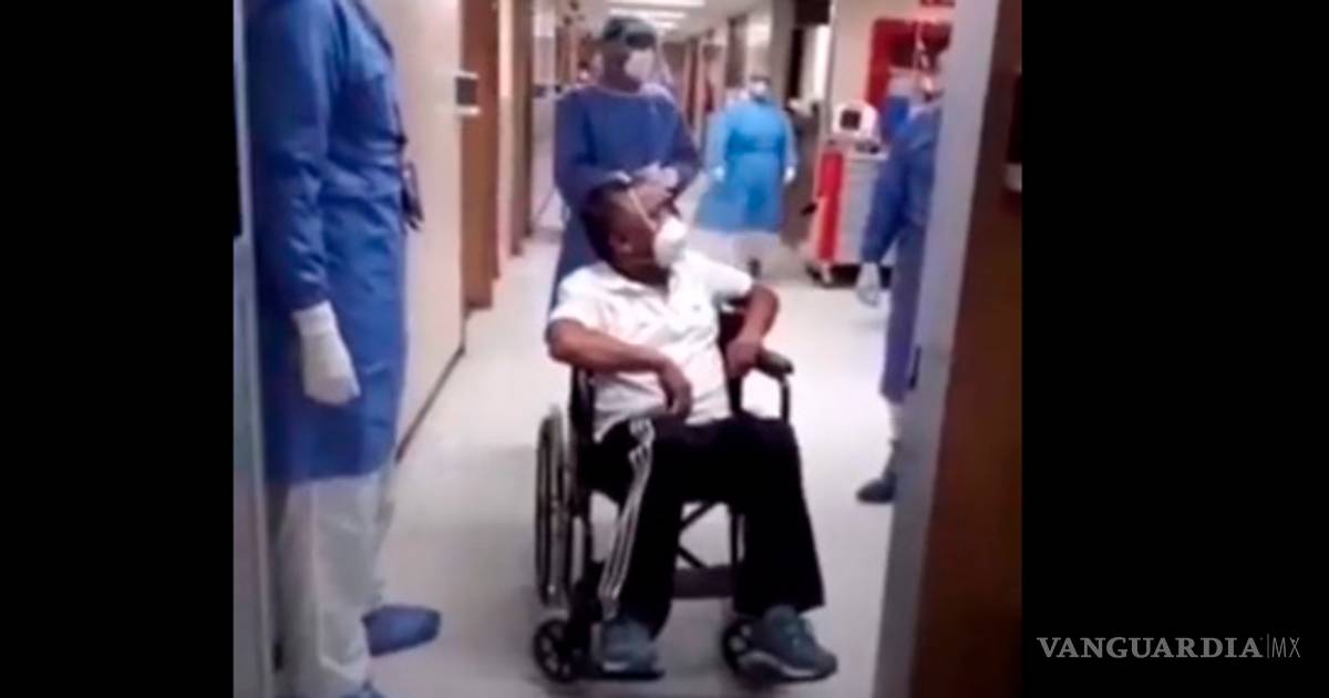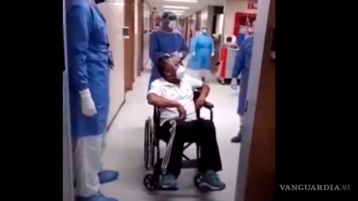 En primera instancia se ve en una silla de ruedas, sin embargo es pasado a otra con la que pudo salir del nosocomio, agradeció a sus compañeros pues sin su apoyo en atenciones necesarias no hubiera podido salir adelante.