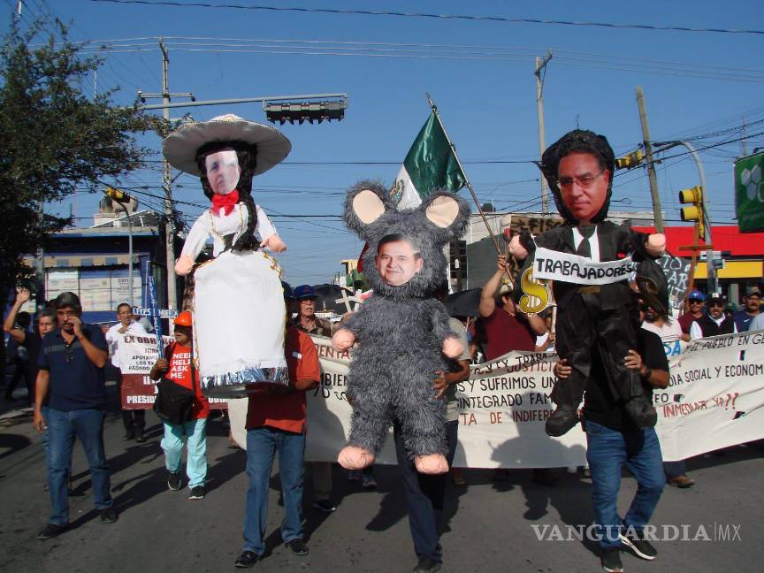 La manifestación, encabezada por Juan Antonio Rubalcaba, presidente de la Asociación Ex Obreros de Coahuila, partió de la calle Venustiano Carranza y recorrió De la Fuente hasta llegar a la Plaza Principal, donde los participantes lanzaron consignas y exigieron soluciones al prolongado conflicto laboral.