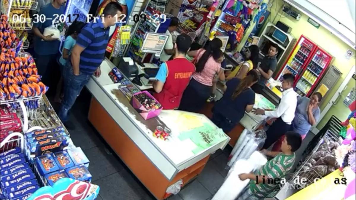 En las imágenes grabadas por las cámaras de vigilancia el pasado 30 de junio, se aprecia que al momento de llegar con el cajero le entrega un billete de 500 pesos para pagar pocos productos. Posteriormente pide que le devuelva el billete y paga con monedas.
