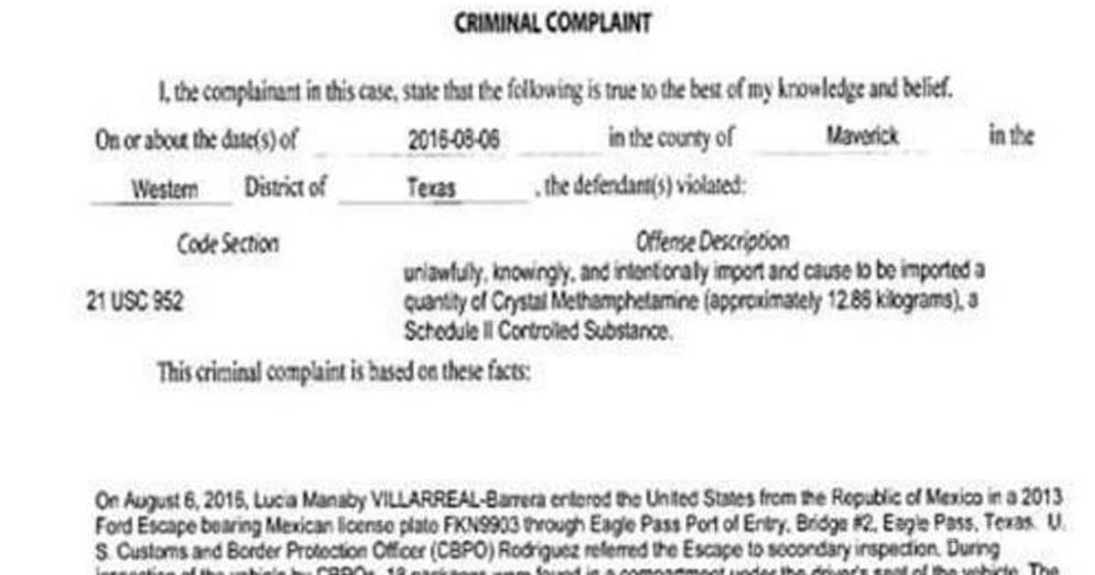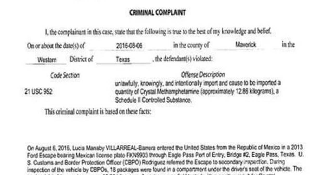 La corte del distrito de Texas abrió el expediente DR16-8354M-01 en el que describe el delito como ilegal e intencional por la importación de 12.83 kilos de metanfetaminas.