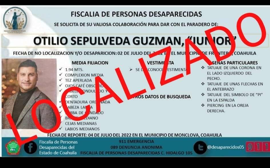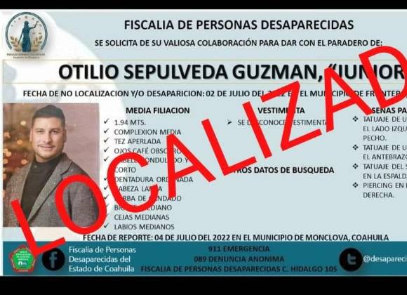MONCLOVA, COAH.- Otilio Sepúlveda Guzmán, mejor conocido como “Junior” y quien es reconocido en la Región Centro del estado como “wedding planner” fue localizado la tarde de este martes 5 de julio, informó la Fiscalía de Personas Desaparecidas del Estado de Coahuila.