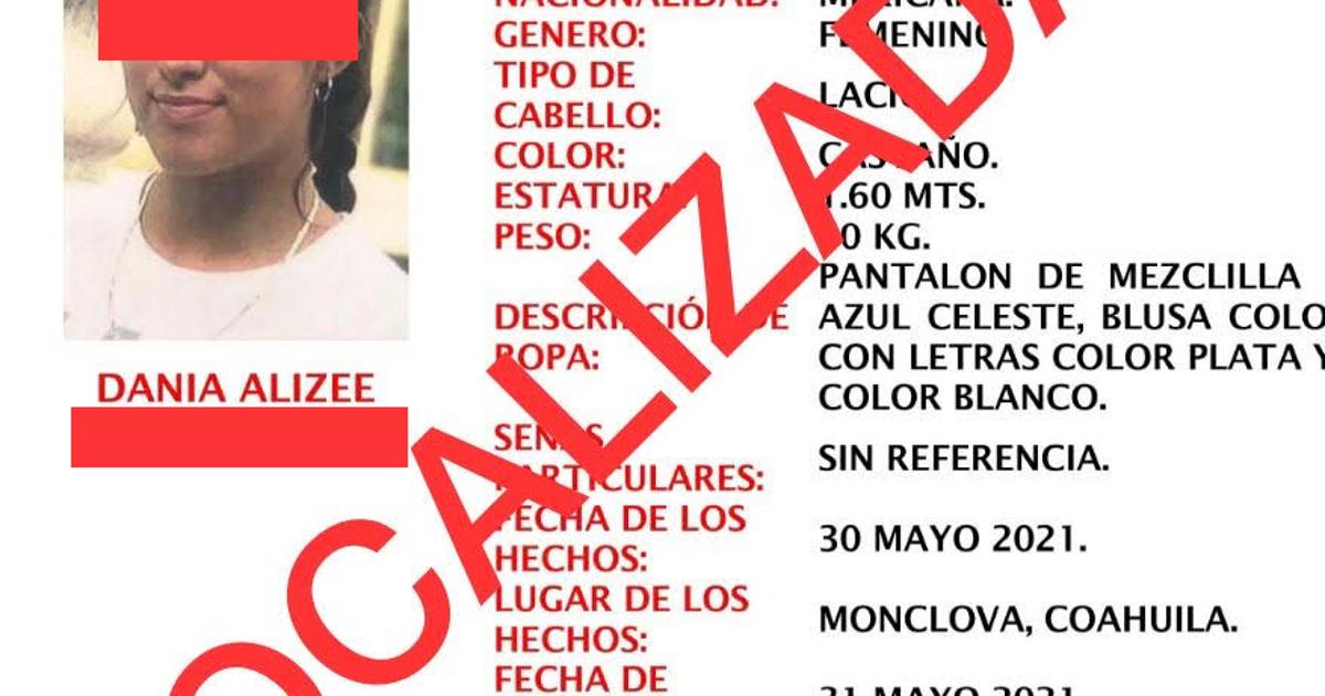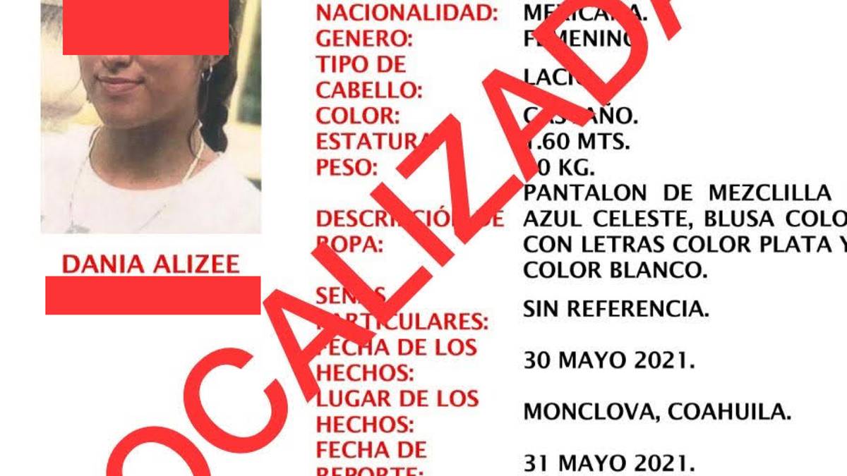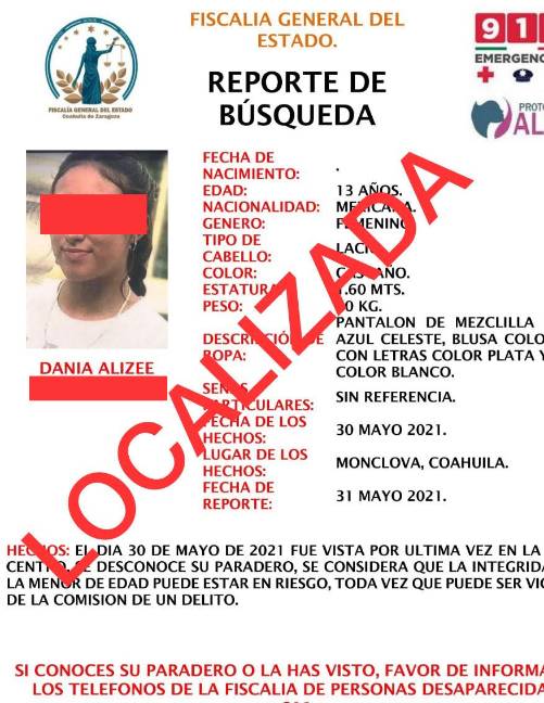 Durante las primeras horas de este martes, se localizó con vida a Dania Alizee Campa Ramos quien se encontraba desaparecida desde el medio día del domingo en Monclova; autoridades indican que se encontraba junto a un hombre que presuntamente sería su pareja.