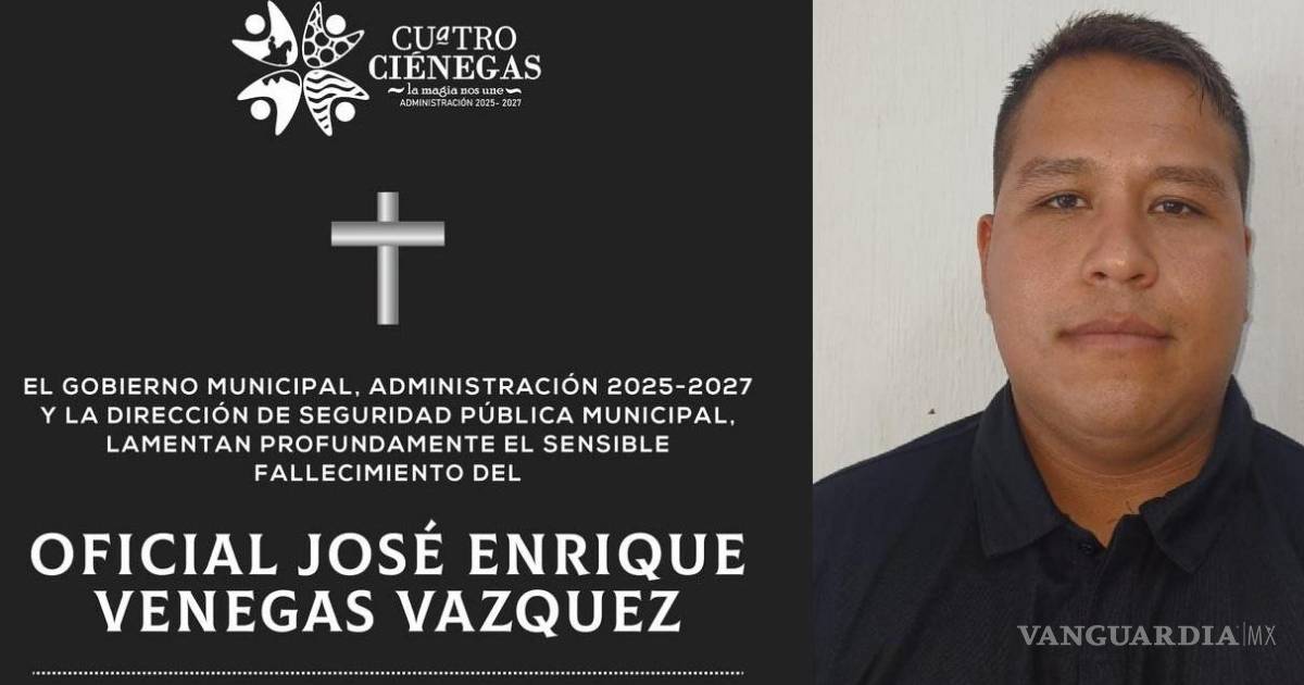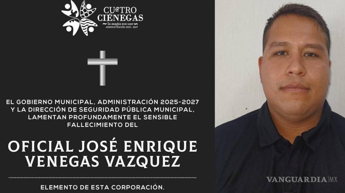 CUATRO CIÉNEGAS, COAH.- Un oficial activo de la Policía Municipal de Cuatro Ciénegas falleció la tarde noche de este lunes tras sufrir un paro cardiaco mientras se encontraba en funciones dentro de la corporación. El elemento fue identificado como José Enrique Venegas Vázquez, de 29 años de edad.
