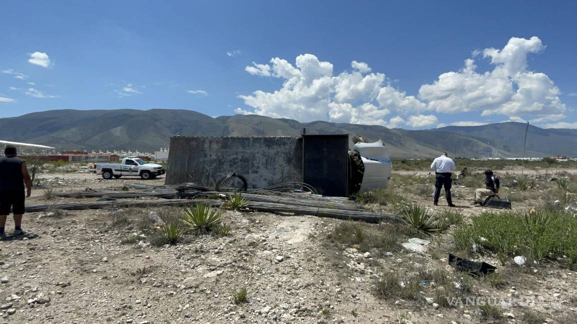 No le responden los frenos y tráiler decide volcarse en baldío al oriente de Saltillo