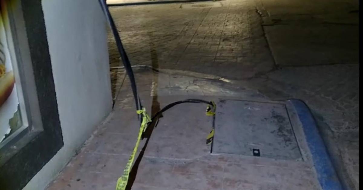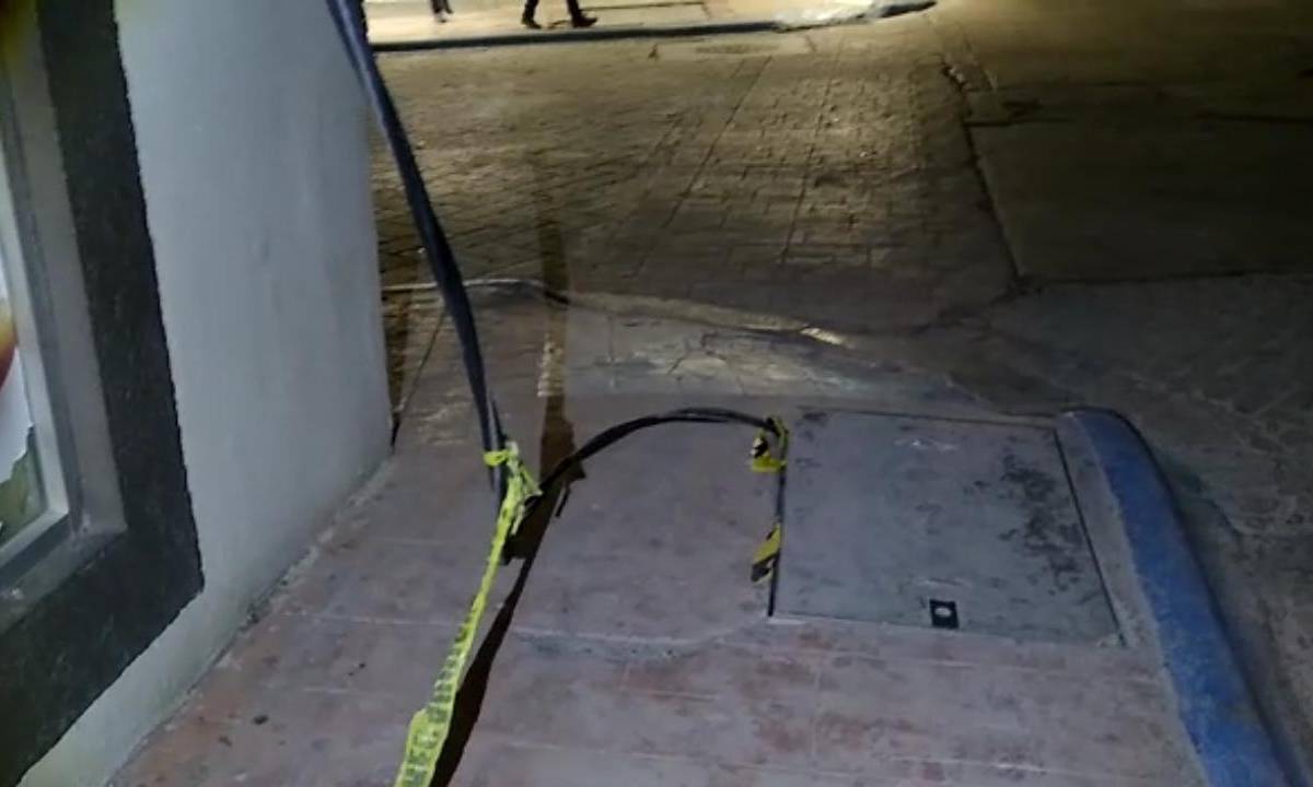 Un cable de alta tensión sale del registro de corriente, donde hay tres líneas vivas y un neutro de 360 voltios, este sube desde las banqueta hasta el techo de un negocio en plena banqueta y entorpeciendo el paso a las rampas para discapacitados.