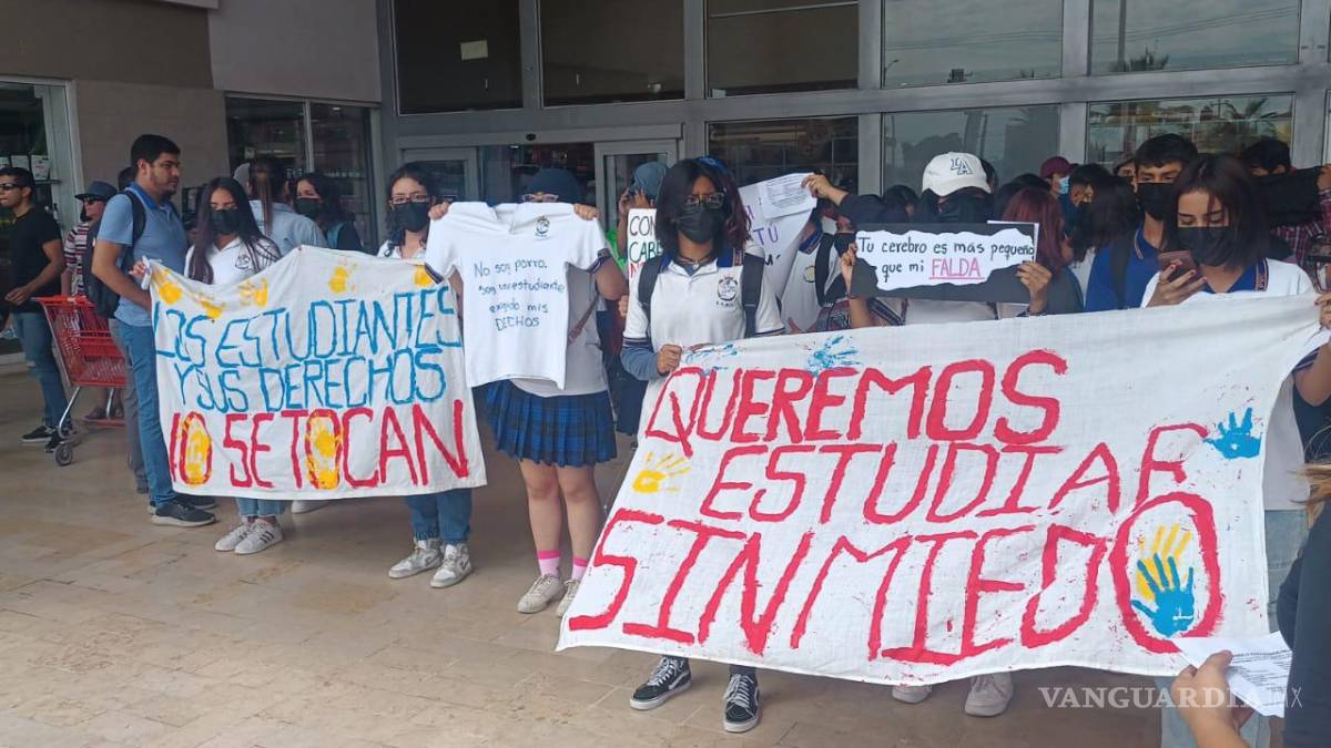 Los estudiantes llevaron lonas y carteles con leyendas de “los estudiantes y sus derechos no se tocan”, “con el cabello no estudia”, “no soy porro, soy estudiante exigiendo mis derechos”, “queremos estudiar sin miedo”, “tu cerebro es más pequeño que mi falda”, “¿mi falda es corta o tú piensas como violador?” y “¡Con PVC no!, los alumnos no se tocan, no se acosan, ni se les amenaza con su futuro”.