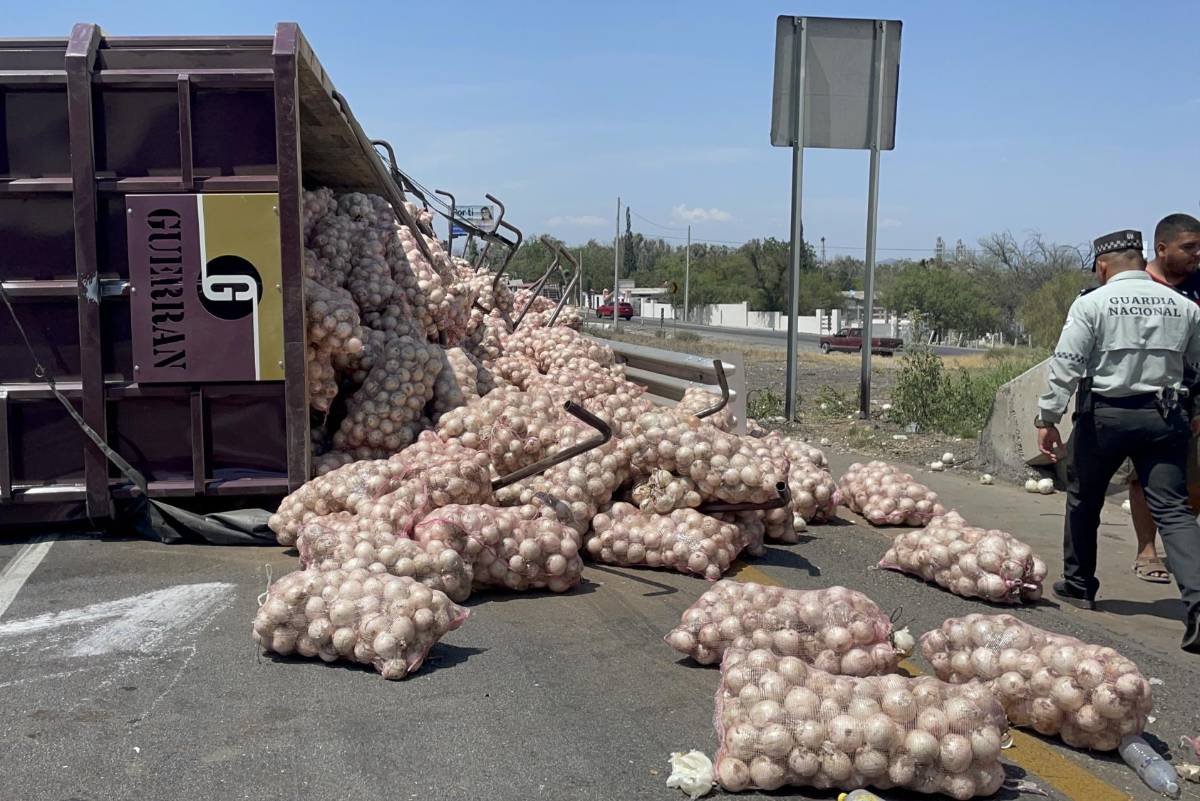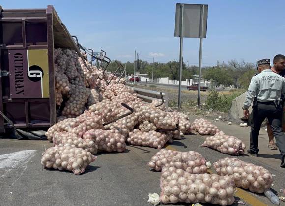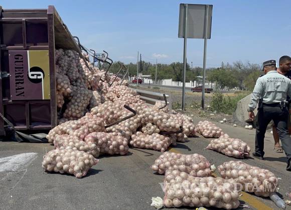 Un camión de carga volcó esta mañana en la carretera Saltillo-Monterrey, en el kilómetro 26, donde se cruza con la autopista, debido a una carga de toneladas de cebollas.