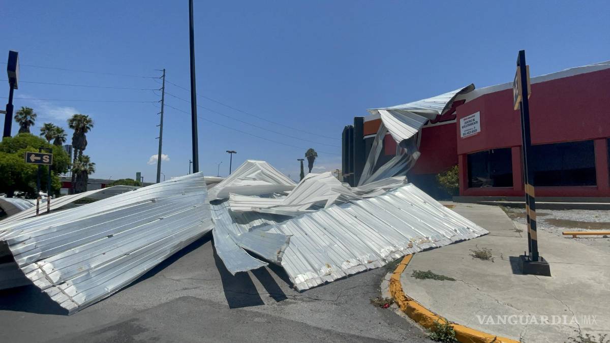 Una violenta ráfaga de viento desprendió el techo de lámina de la Refaccionaria Auto Zone, ubicada en la esquina de José María Lafragua y Luis Echeverría Álvarez en la colonia Guanajuato, en Saltillo.