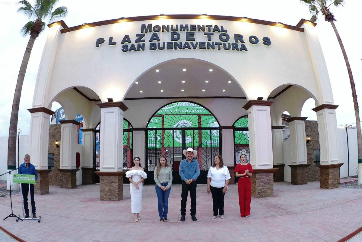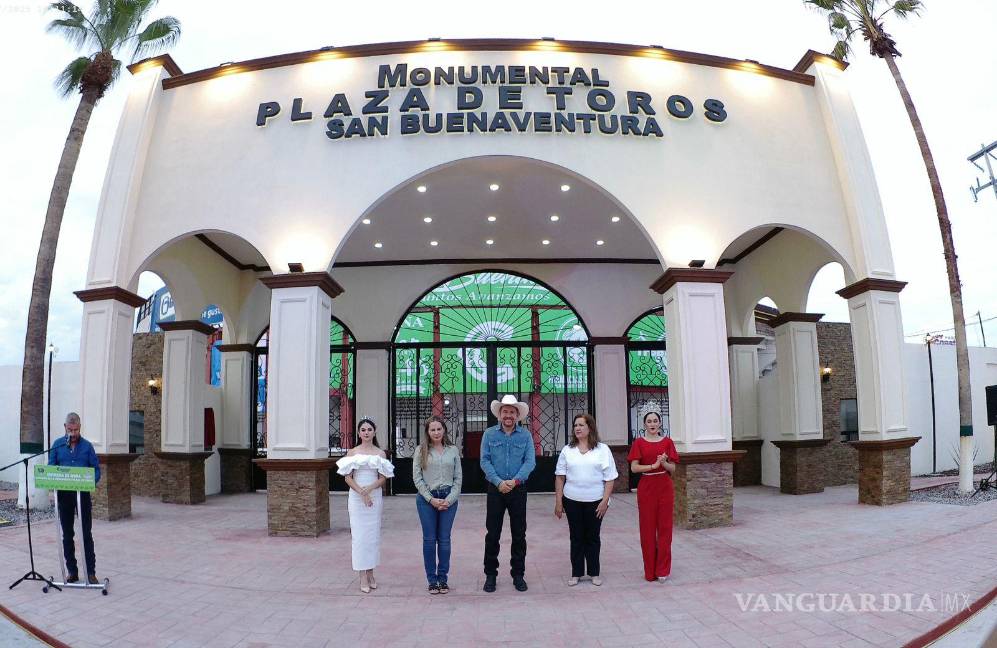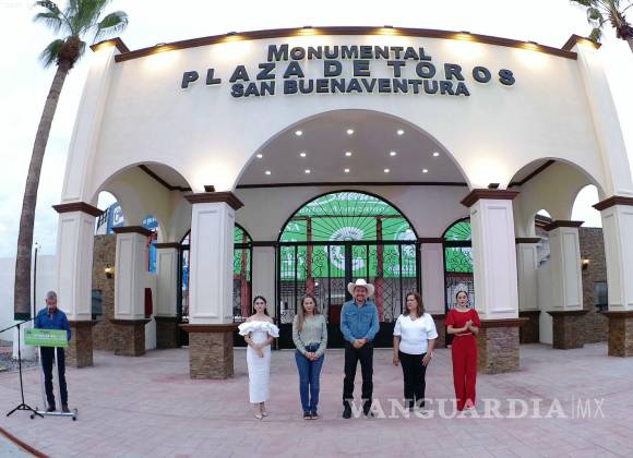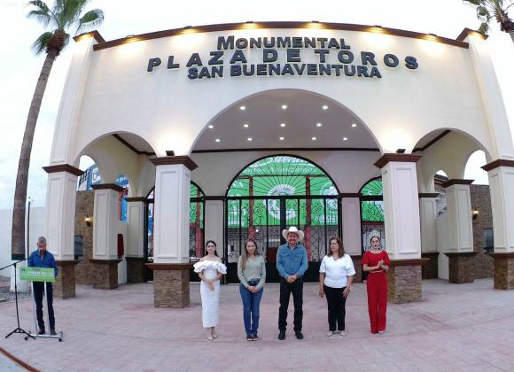 SAN BUENAVENTURA, COAH.- A pocas horas de que inicie la Feria de San Buenaventura en su 80 aniversario, autoridades estatales y municipales inauguraron la nueva fachada de la Monumental Plaza de Toros, sede de la coronación de la Reina y de presentaciones artísticas.