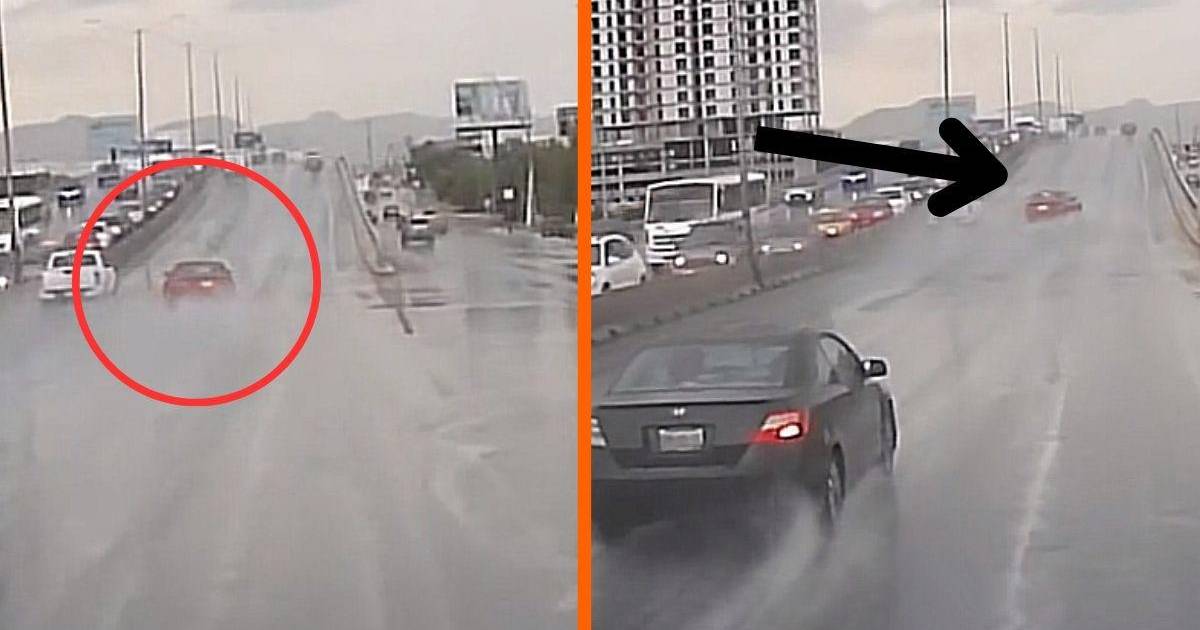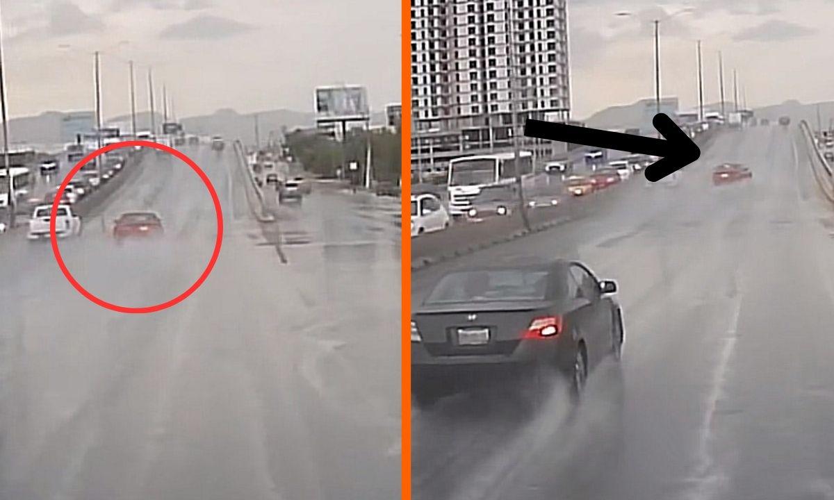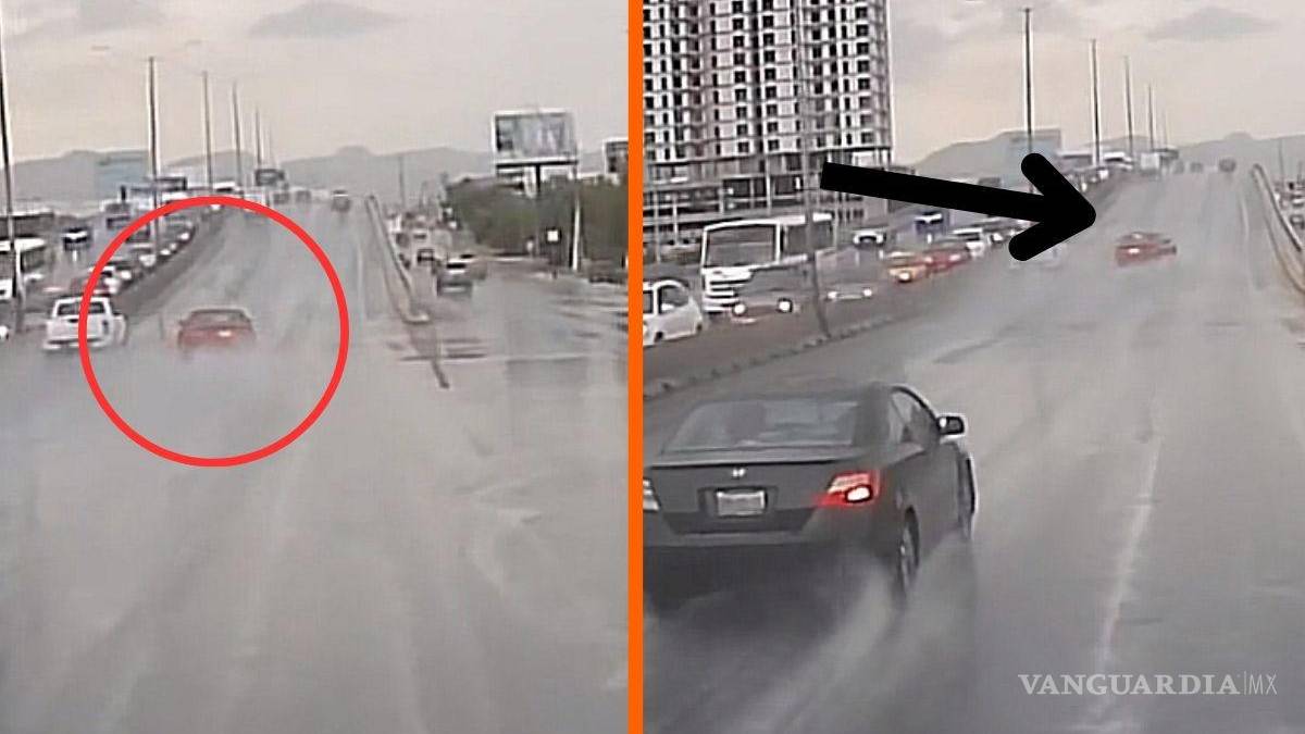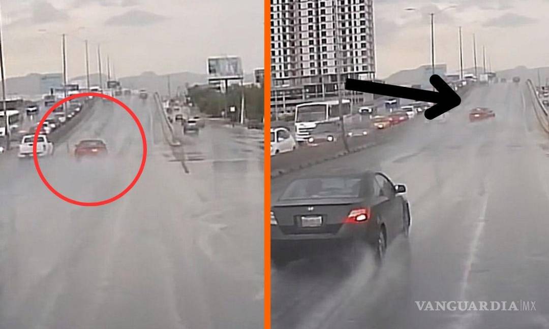 Los hechos ocurrieron en el bulevar Nazario Ortiz, al norte de Saltillo. En las imágenes se puede ver cómo un vehículo de color rojo derrapa a gran velocidad sobre el pavimento húmedo.