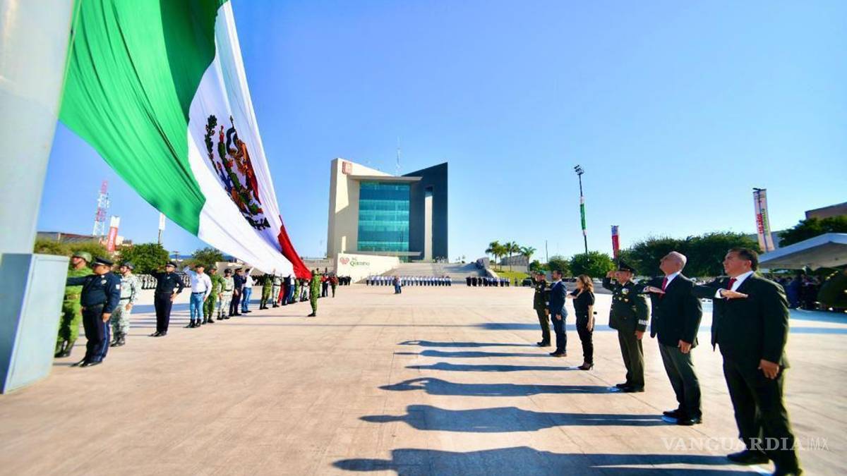 TORREÓN, COAHUILA. - El alcalde de Torreón, Román Alberto Cepeda González, presidió la ceremonia de Izamiento de la Bandera Nacional en la explanada de la Plaza Mayor, acompañado de autoridades civiles y militares en el marco de las fiestas patrias por la Independencia de México y del 116 aniversario de la ciudad.