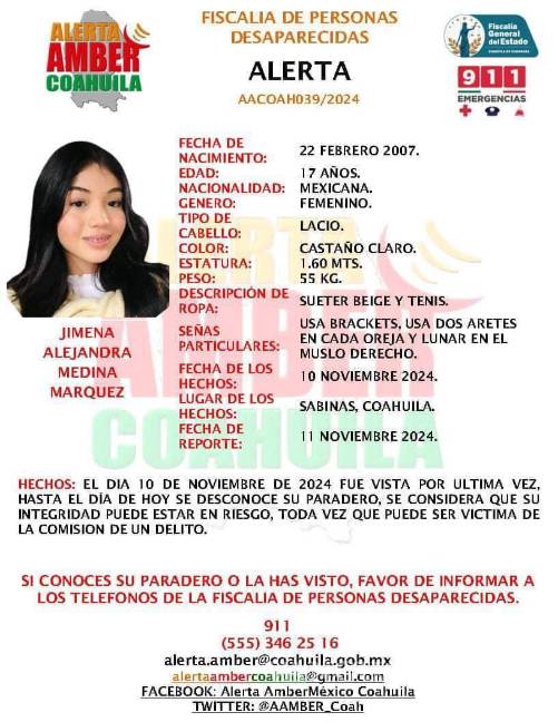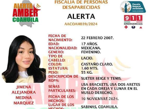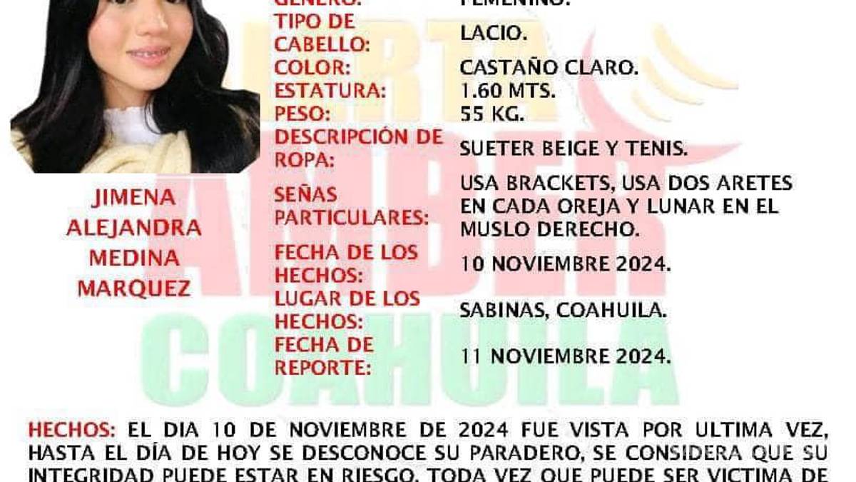 La desaparición de Jimena ha conmocionado a Sabinas, y el caso sigue siendo uno de los principales focos de atención de las autoridades locales, que redoblan esfuerzos para esclarecer este caso y lograr el regreso seguro de la joven.