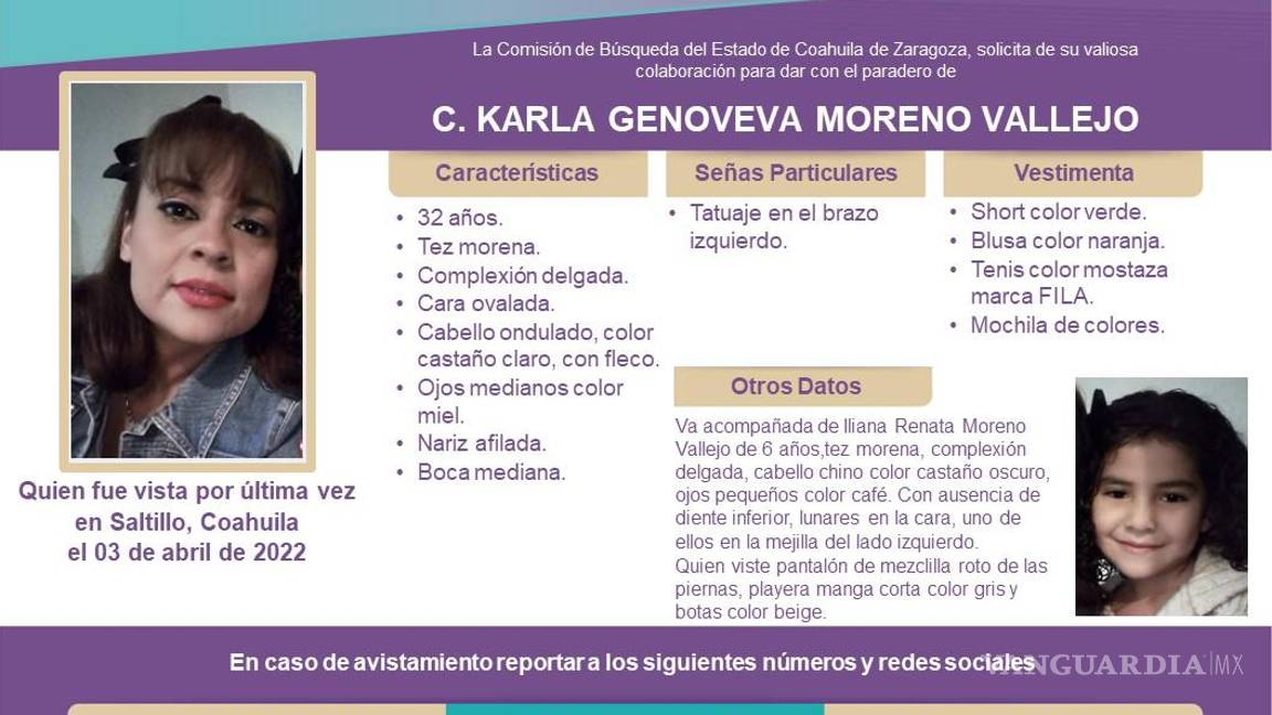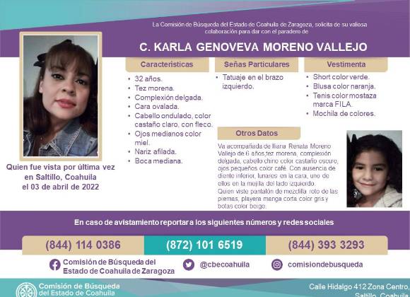 Desde el 04 de abril del año en curso la Comisión de Búsqueda del Estado de Coahuila emitió una ficha de búsqueda de la menor Iliana Renata Moreno Vallejo de 6 años de edad quien fue arrebatada del seno de su abuela a manos de su madre, Karla Genoveva Moreno Vallejo, de 32 años.