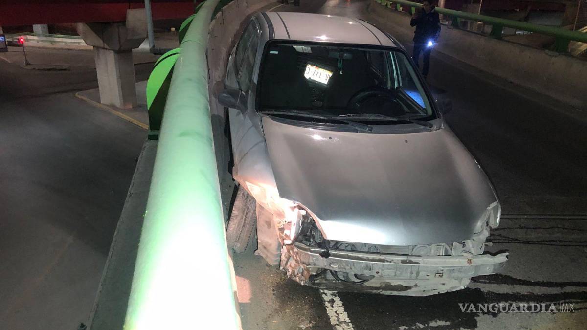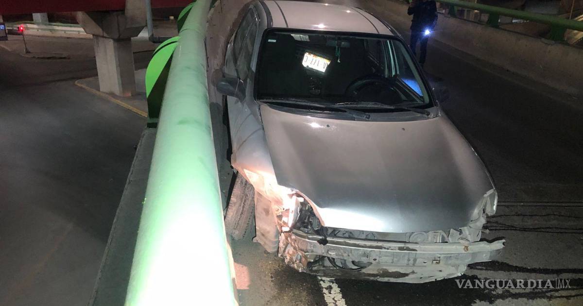 El conductor de un vehículo Chevy terminó con su costado derecho totalmente destruido tras impactarse contra la barrera de contención del distribuidor vial “El Sarape”, al oriente de Saltillo, tras presuntamente esquivar a otro automóvil.