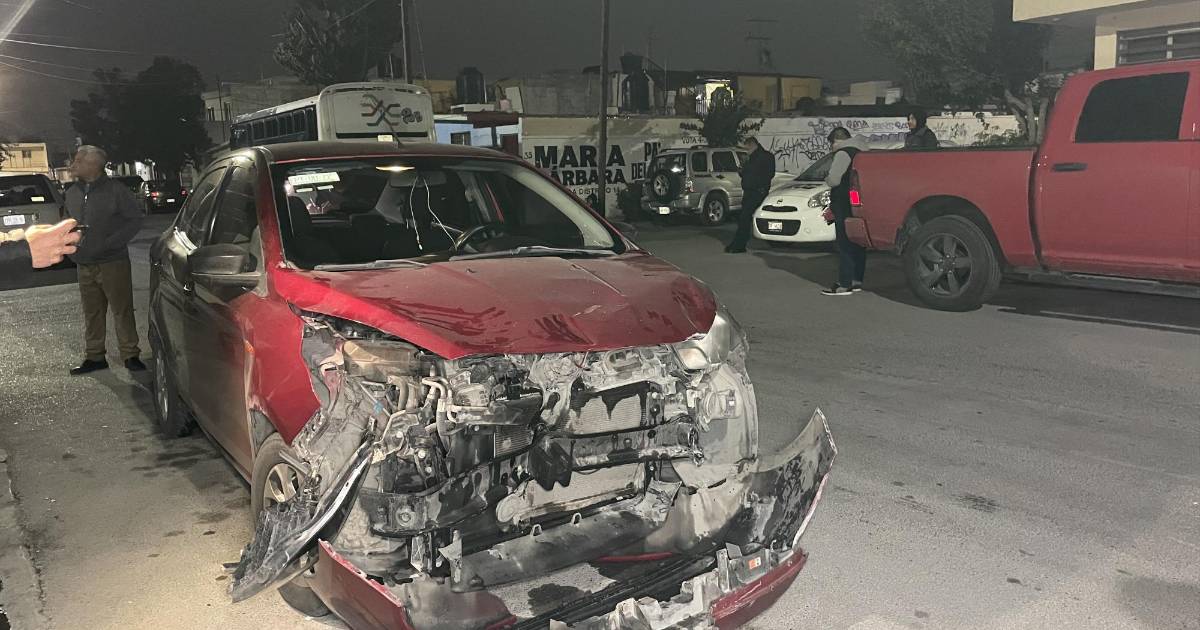 Tras el impacto, el auto Nissan realizó un giro aproximado de 90 grados y fue a dañar dos vehículos estacionados: una camioneta Chevrolet y de un automóvil Aveo.