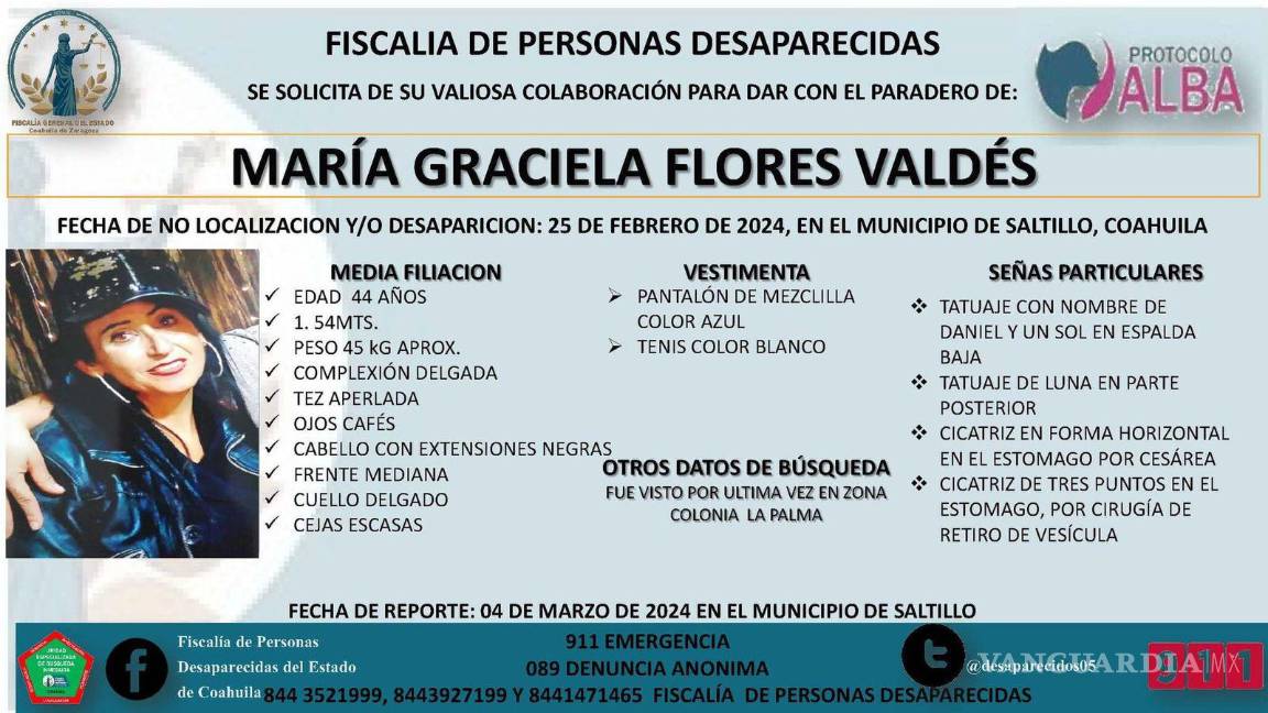 El pasado lunes 4 de marzo, la Fiscalía de Personas Desaparecidas emitió una ficha de búsqueda en nombre de María Graciela Flores Valdez, una mujer de 44 años que sufre de adicción a las drogas. Desapareció de Saltillo junto con su hija de 16 años el pasado 25 de febrero, y su familia solicita el apoyo de las autoridades para localizarlas.