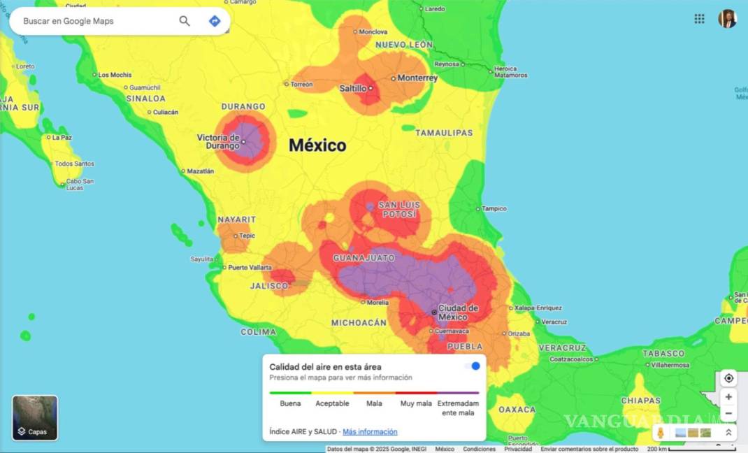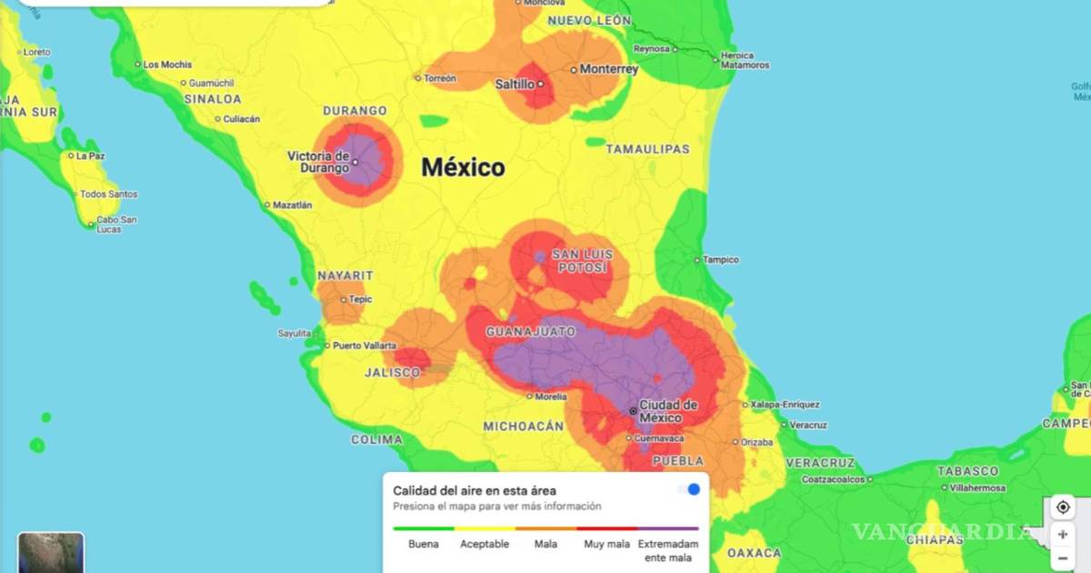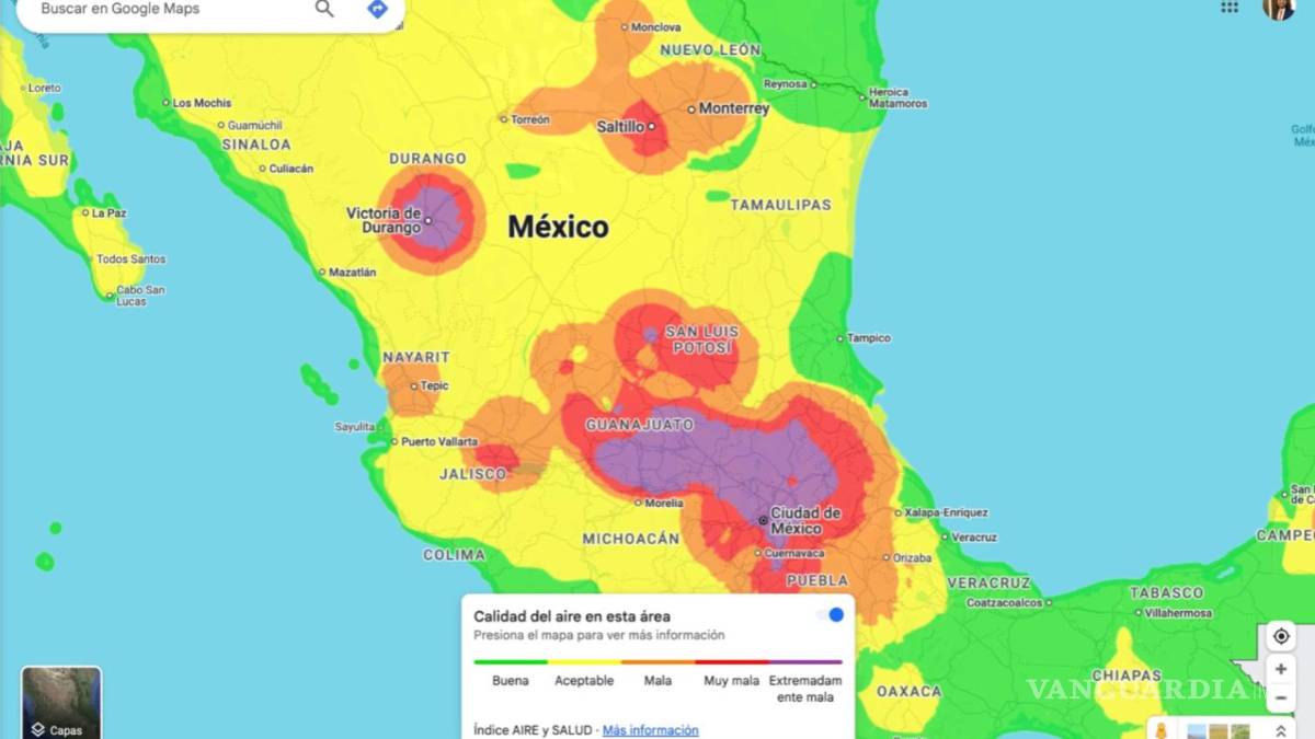Registros de Google Maps tomados en cuenta la tarde de este jueves 20 de marzo mostraron que ciudades mexicanas como Saltillo, Monterrey o Ciudad de México se encuentran entre las que presentan mayor contaminación del aire en Norteamérica.