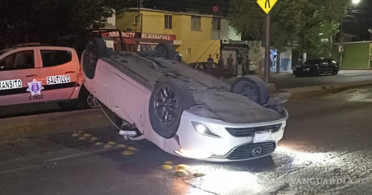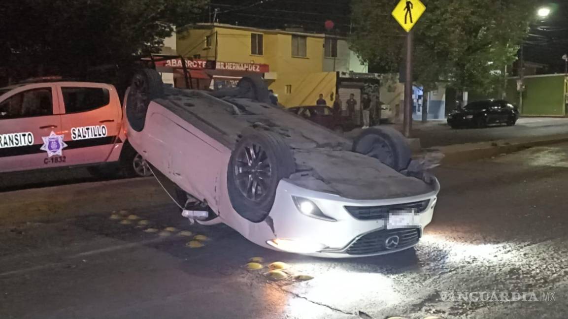 Saltillo: mujer se queda dormida al volante y vuelca su vehículo; causó daños a dos autos estacionados