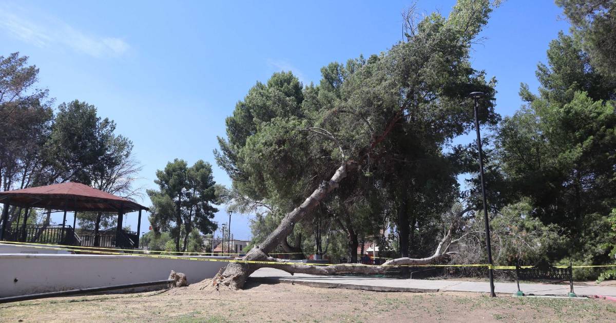 De acuerdo con la señora Conchita, vecina de la colonia, Protección Civil acudió el pasado 8 de junio a acordonar una parte de la plaza donde un pino había sido derribado por los fuertes vientos y lluvias, haciendo que a su vez cayera encima de otro árbol. Ambos terminaron colapsando, junto con dos luminarias que estaban a su paso.
