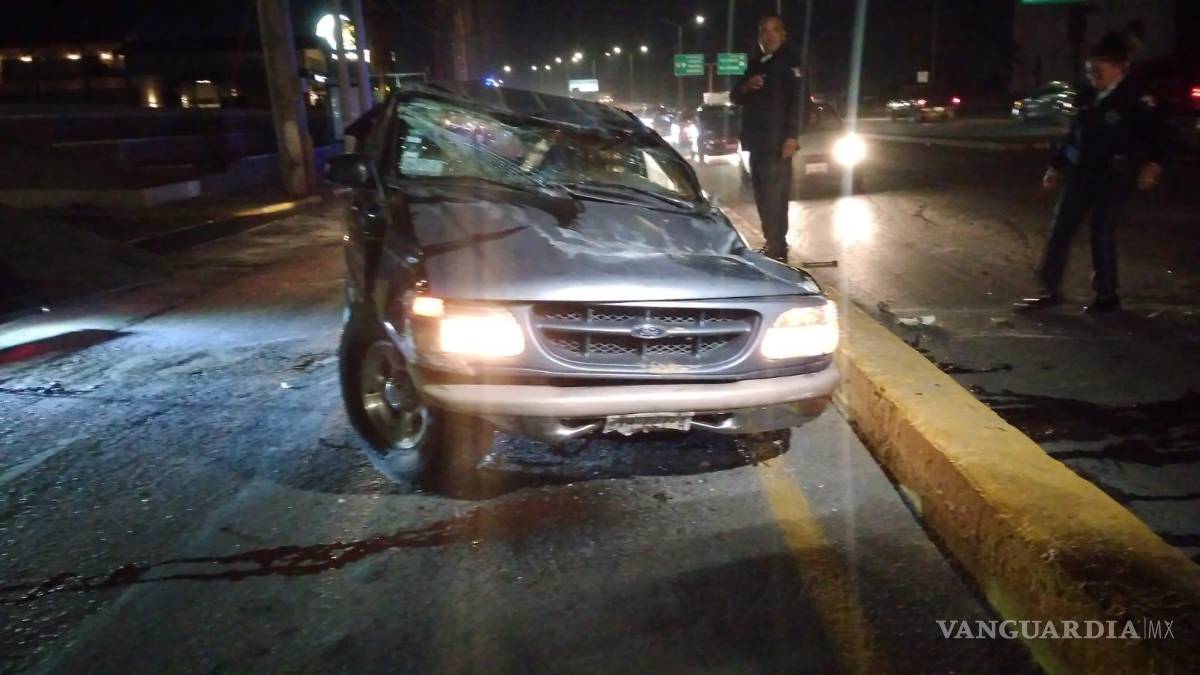 En dirección de poniente a oriente, una camioneta Ford quedó volcada sobre el periférico Luis Echeverría de Saltillo, tras impactar contra el muro de contención del carril contrario, luego irse contra la ballena y finalmente volcar y terminar con las llantas al aire.