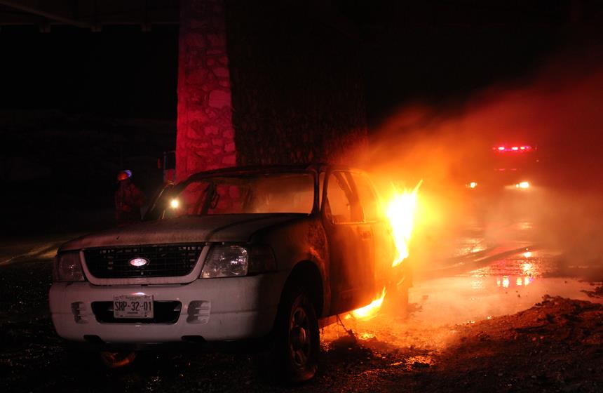 Saltillo, Coahuila. Los cuerpos calcinados de cinco hombres atados de pies y manos y con un balazo en la cabeza fueron localizados por la madrugada dentro de una camioneta abajo del puente Paso del Aguila, en Ramos Arizpe.