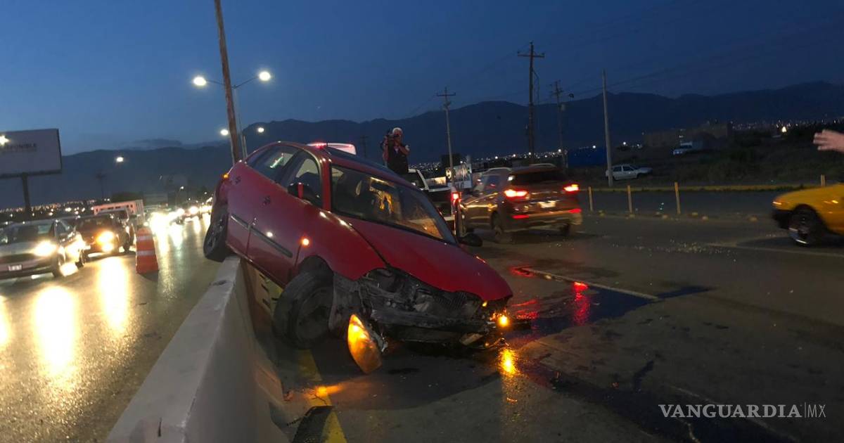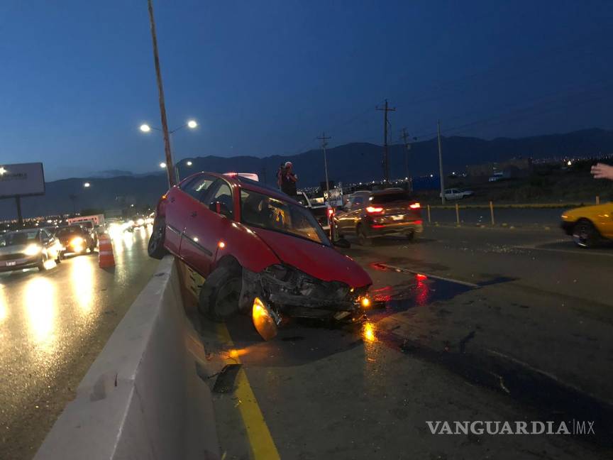 El exceso de velocidad de un automovilista al circular por Nazario Ortiz Garza, con dirección al  Periférico, lo hizo perder el control y derribar las ballenas del muro de contención, hasta quedar arriba de una de estas.